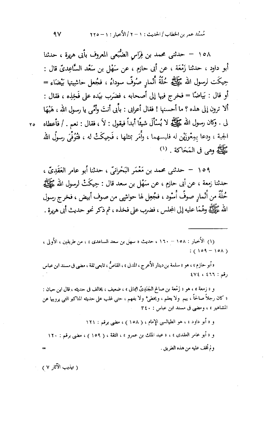 159 - حَدَّثَنِي مُحَمَّدُ بْنُ مَعْمَرٍ الْبَحْرَانِيُّ، حَدَّثَنَا أَبُو عَامِرٍ الْعَقَدِيُّ، حَدَّثَنَا زَمْعَةُ، عَنْ أَبِي حَازِمٍ، عَنْ سَهْلِ بْنِ سَعْدٍ، قَالَ: حِيكَتْ لِرَسُولِ اللَّهِ صَلَّى اللهُ عَلَيْهِ وَسَلَّمَ حُلَّةٌ مِنْ أَنْمَارٍ صُوفٌ أَسْوَدُ، فَجَعَلَ لَهَا حَوَاشِيَ مِنْ صُوفٍ أَبْيَضَ، فَخَرَجَ رَسُولُ اللَّهِ صَلَّى اللهُ عَلَيْهِ وَسَلَّمَ وَهُمَا عَلَيْهِ إِلَى الْمَجْلِسِ، فَضَرَبَ عَلَى فَخِذِهِ، ثُمَّ ذَكَرَ نَحْوَ حَدِيثِ أَبِي هُرَيْرَةَ