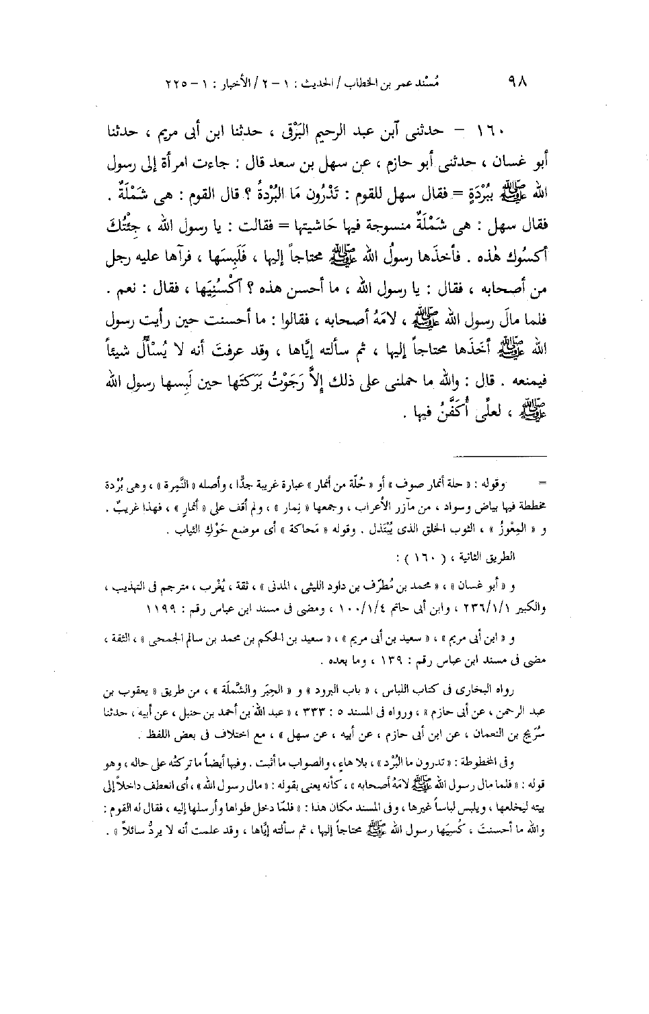 160 - حَدَّثَنِي ابْنُ عَبْدِ الرَّحِيمِ الْبَرْقِيُّ، حَدَّثَنَا ابْنُ أَبِي مَرْيَمَ، حَدَّثَنَا أَبُو غَسَّانَ، حَدَّثَنِي أَبُو حَازِمٍ، عَنْ سَهْلِ بْنِ سَعْدٍ، قَالَ: جَاءَتِ امْرَأَةٌ إِلَى رَسُولِ اللَّهِ صَلَّى اللهُ عَلَيْهِ وَسَلَّمَ بِبُرْدَةٍ، فَقَالَ سَهْلٌ لِلْقَوْمِ: تَدْرُونَ مَا الْبُرْدَةُ؟ قَالَ الْقَوْمُ: هِيَ شَمْلَةٌ، فَقَالَ سَهْلٌ: هِيَ شَمْلَةٌ مَنْسُوجَةٌ فِيهَا حَاشِيَتُهَا، فَقَالَتْ: يَا رَسُولَ اللَّهِ، جِئْتُكَ أَكْسُوكَ هَذِهِ، §فَأَخَذَهَا رَسُولُ اللَّهِ صَلَّى اللهُ عَلَيْهِ وَسَلَّمَ مُحْتَاجًا إِلَيْهَا، فَلَبِسَهَا، فَرَآهَا عَلَيْهِ رَجُلٌ مِنْ أَصْحَابِهِ، فَقَالَ: يَا رَسُولَ اللَّهِ، مَا أَحْسَنَ هَذِهِ اكْسُنِيهَا، فَقَالَ: «نَعَمْ» . فَلَمَّا مَالَ رَسُولُ اللَّهِ صَلَّى اللهُ عَلَيْهِ وَسَلَّمَ لَامَهُ أَصْحَابُهُ، فَقَالُوا: مَا أَحْسَنْتَ حِينَ رَأَيْتَ رَسُولَ اللَّهِ صَلَّى اللهُ عَلَيْهِ وَسَلَّمَ أَخَذَهَا مُحْتَاجًا إِلَيْهَا، ثُمَّ سَأَلْتَهُ إِيَّاهَا، وَقَدْ عَرَفْتَ أَنَّهُ لَا يُسْأَلُ شَيْئًا فَيَمْنَعُهُ، قَالَ: وَاللَّهِ مَا حَمَلَنِي عَلَى ذَلِكَ إِلَّا رَجَوْتُ بَرَكَتَهَا حِينَ لَبِسَهَا رَسُولُ اللَّهِ صَلَّى اللهُ عَلَيْهِ وَسَلَّمَ، لَعَلِّي أُكَفَّنُ فِيهَا