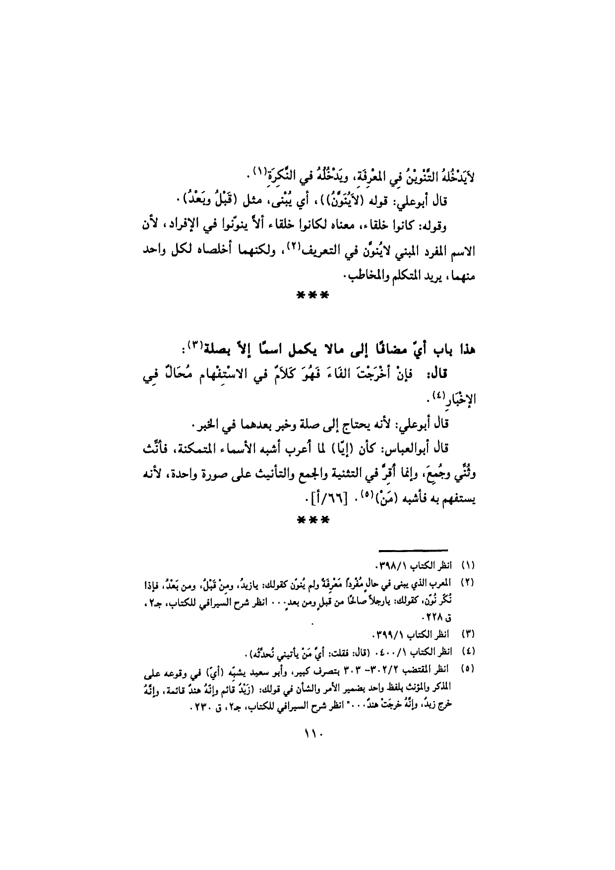 وقوله: كانوا خلقاء، معناه لكانوا خلقاء ألاّ ينوّنوا في الإفراد، لأن الاسم المفرد المبني لا يُنَوَّن في التعريف، ولكنهما أخلصاه لكل واحد منهما، يريد المتكلم والمخاطب.