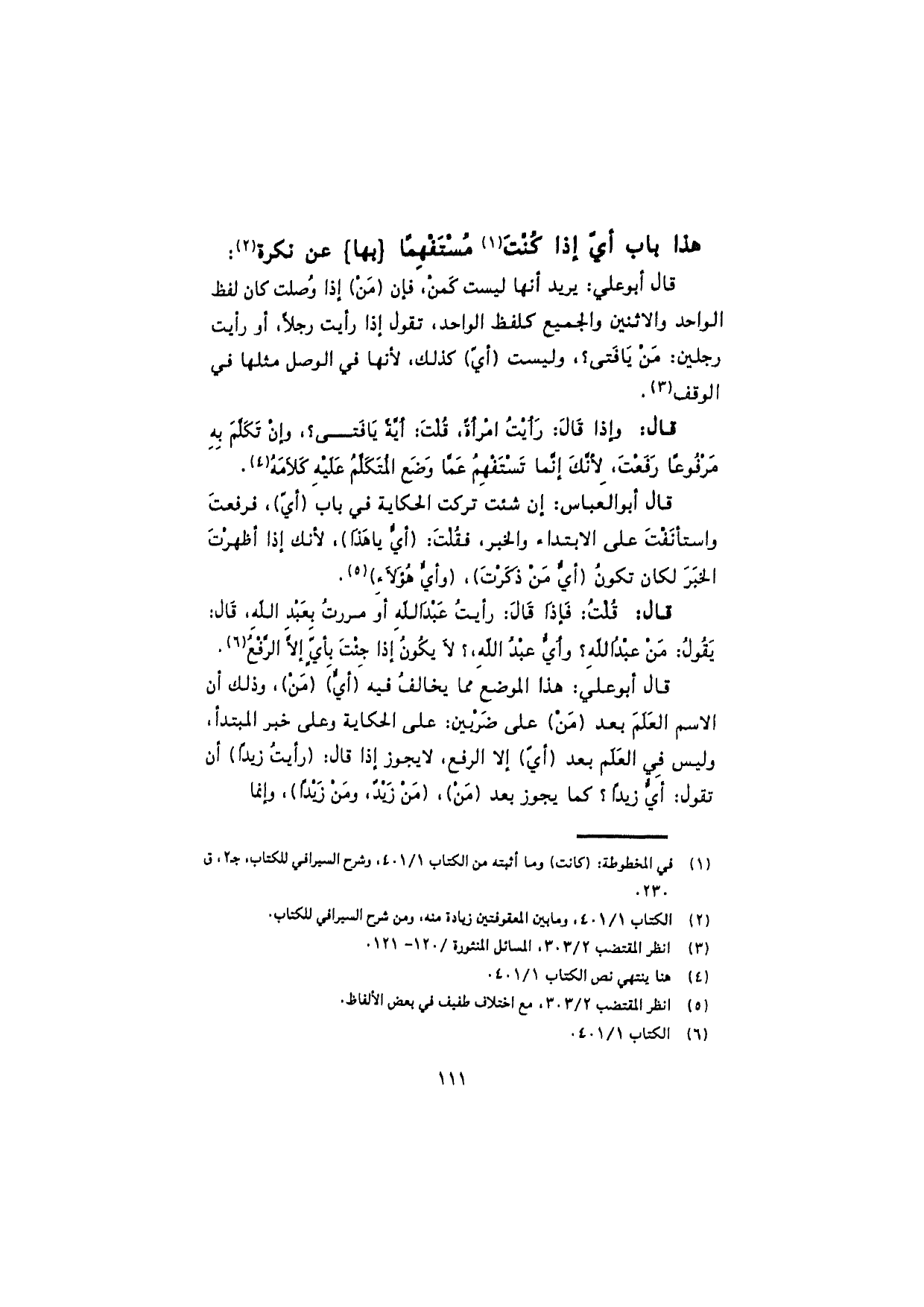 قال: وإذا قال: رأيتُ امرأةً، قلت: أيّة يا فتى؟، وإنْ تَكَلَّم به مرفوعًا رفعتَ، لأنّك إنّما تستفهم عَمّا وضع المُتَكلم عليه كلامَه.