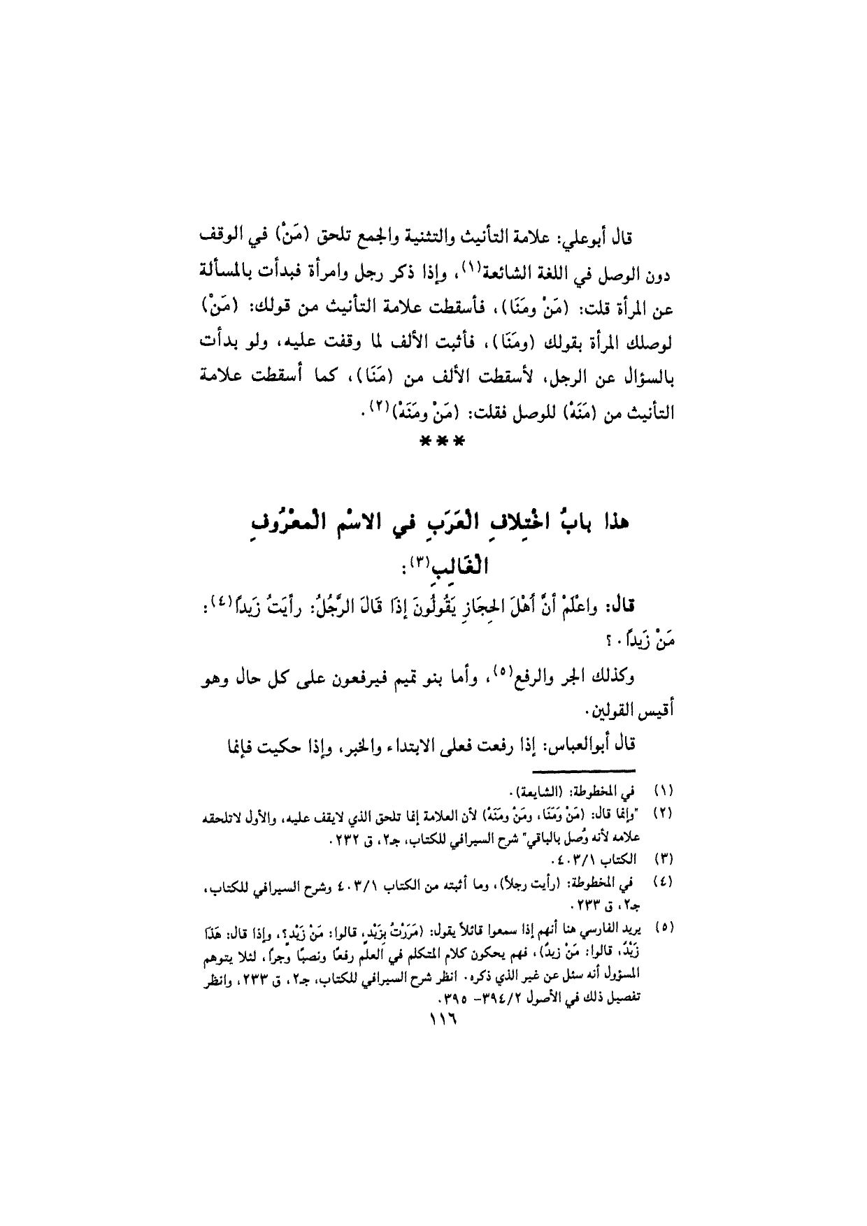 قال أبو علي: علامة التأنيث والتثنية والجمع تلحق (مَنْ) في الوقف دون الوصل في اللغة الشائعة، وإذا ذكر رجل وامرأة فبدأت بالمسألة عن المرأة قلت: (مَنْ ومَنا)، فأسقطت علامة التأنيث من قولك: (مَنْ) لوصلك بالمرأة بقولك (ومَنا)، فأثبت الألف لما وقفت عليه، ولو بدأت بالسؤال عن الرجل، لأسقطت الألف من (مَنا)، كما أسقطت علامة التأنيث من (مَنَهْ) للوصل فقلت: (مَنْ ومَنَهْ).