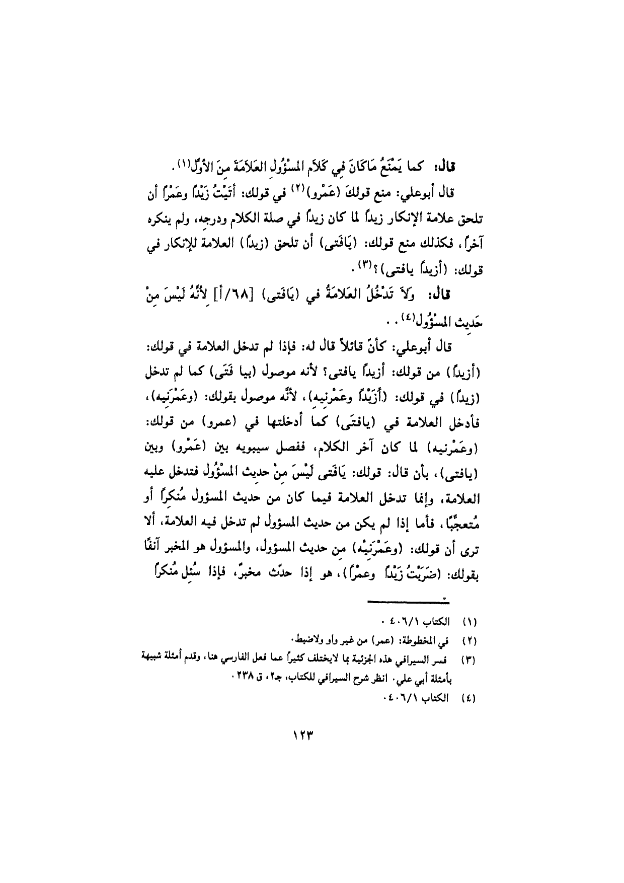 قال أبو علي: كأنّ قائلاً قال له: فإذا لم تدخل العلامة في قولك: (أزيدًا) من قولك: أزيدًا يا فتى؟ لأنه موصول (بيا فتى) كما لم تدخل (زيدًا) في قولك: (أزيدًا وعَمْرَنِيه)، لأنّه موصول بقولك: (وعَمْرَنيه)، فأدخل العلامة في (يافتى) كما أدخلتها في (عمرو) من قولك: (وعَمْرنيه) لما كان آخر الكلام: ففصل سيبويه بين (عَمْرو) وبين (يافتى)، بأن قال: قولك يافتى ليس من حديث المسؤول فتدخل عليه العلامة، وإنما تدخل العلامة فيما كان من حديث المسؤول مُنكرًا أو مُتعجّبًا، فأما إذا لم يكن من حديث المسؤول لم تدخل فيه العلامة، ألا ترى أن قولك: (وعَمْرَنيه) مِن حديث المسؤول، والمسؤول هو المخبر آنفًا بقولك: (ضربتُ زيدًا وعمرًا)، هو إذا حدّث مخبرٌ، فإذا سُئِل مُنكرًا