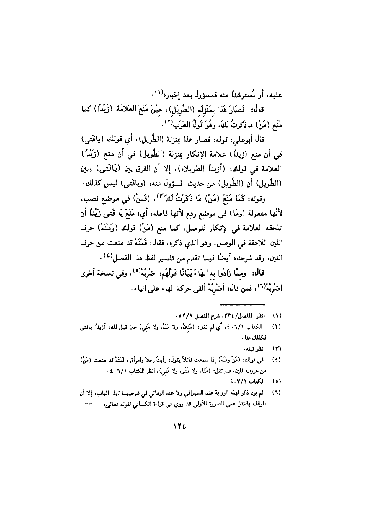 قال أبو علي: قوله: فصار هذا بمنزلة (الطويل)، أي قولك (يافتى) في أن منع (زيدًا) علامة الإنكار بمنزلة (الطّويل) في أن منع (زيدًا) العلامة في قولك: (أزيدًا الطويلاه)، إلا أن الفرق بين (يافتى) وبين (الطويل) أن (الطويل) من حديث المسؤول عنه، (ويا فتى) ليس كذلك.