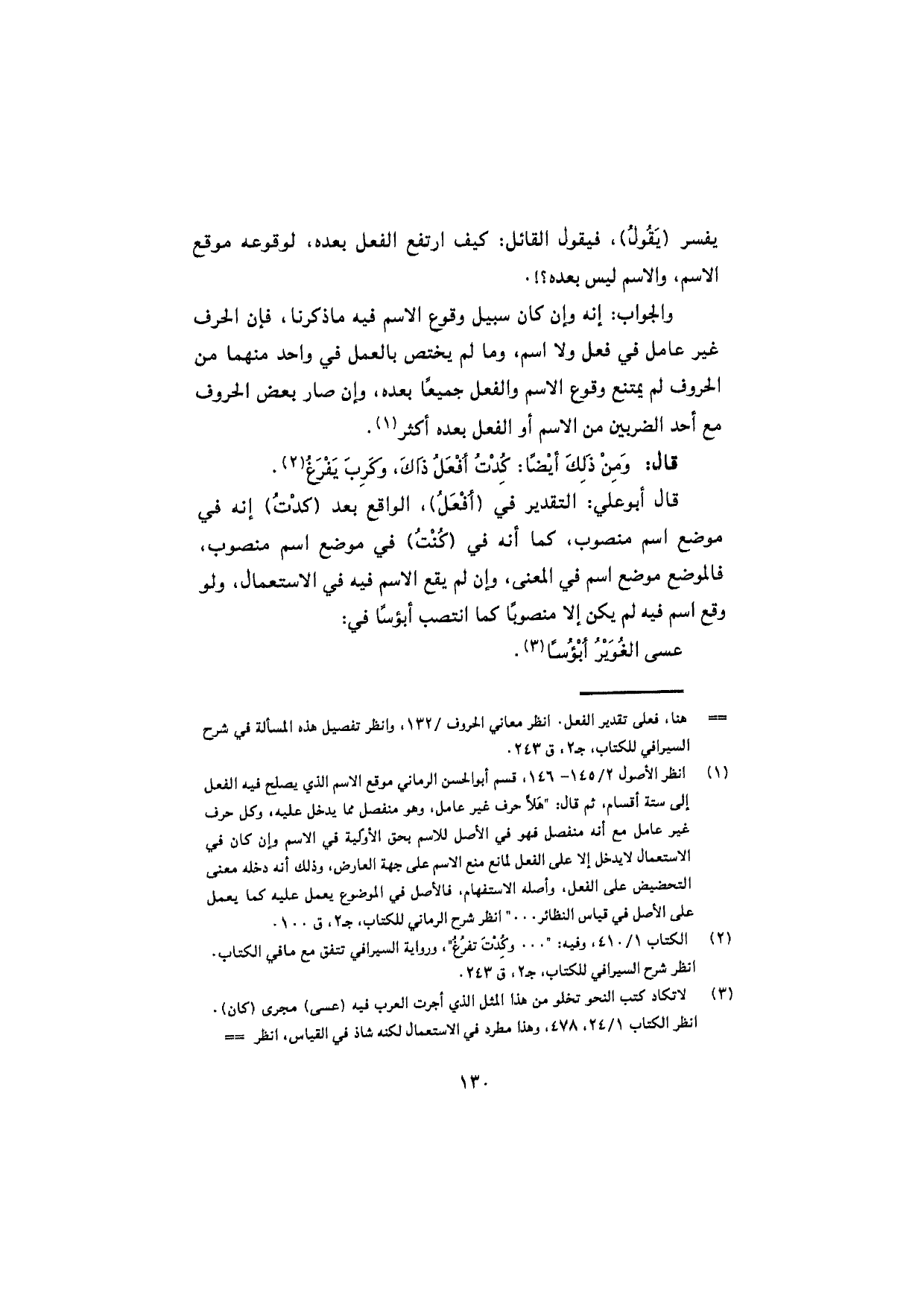 يفسر (يَقولُ)، فيقول القائل: كيف ارتفع الفعل بعده، لوقوعه موقع الاسم، والاسم ليس بعده؟!.