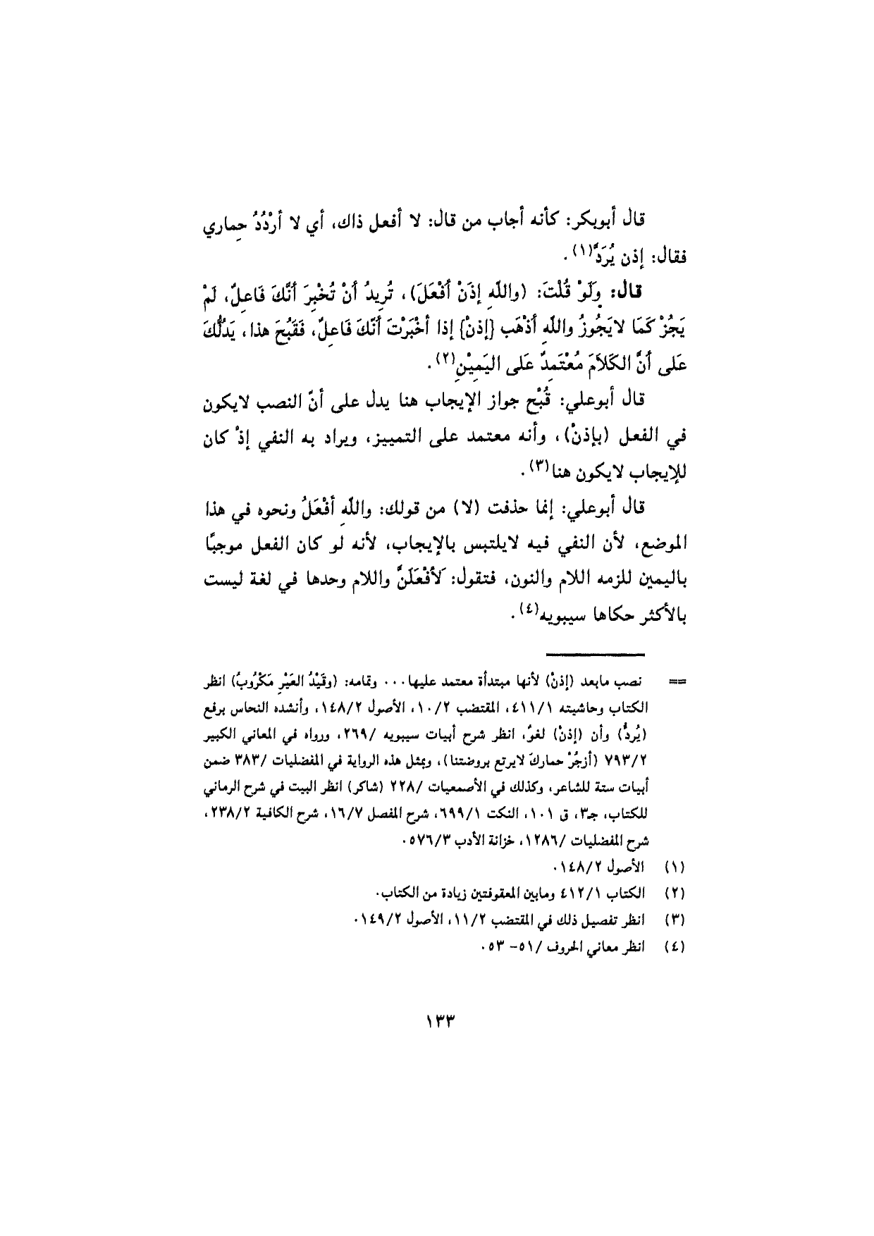 قال: ولو قلت: (والله إذنْ أفعَلَ)، تريد أن تخبر أنك فاعلٌ، لم يجز كما لا يجوز واللهِ أذهب} إذن {إذا أخبرت أنك فاعلٌ، فَقَبُحَ هذا، يَدُلُّك على أنّ الكلام معتمد على اليمين.