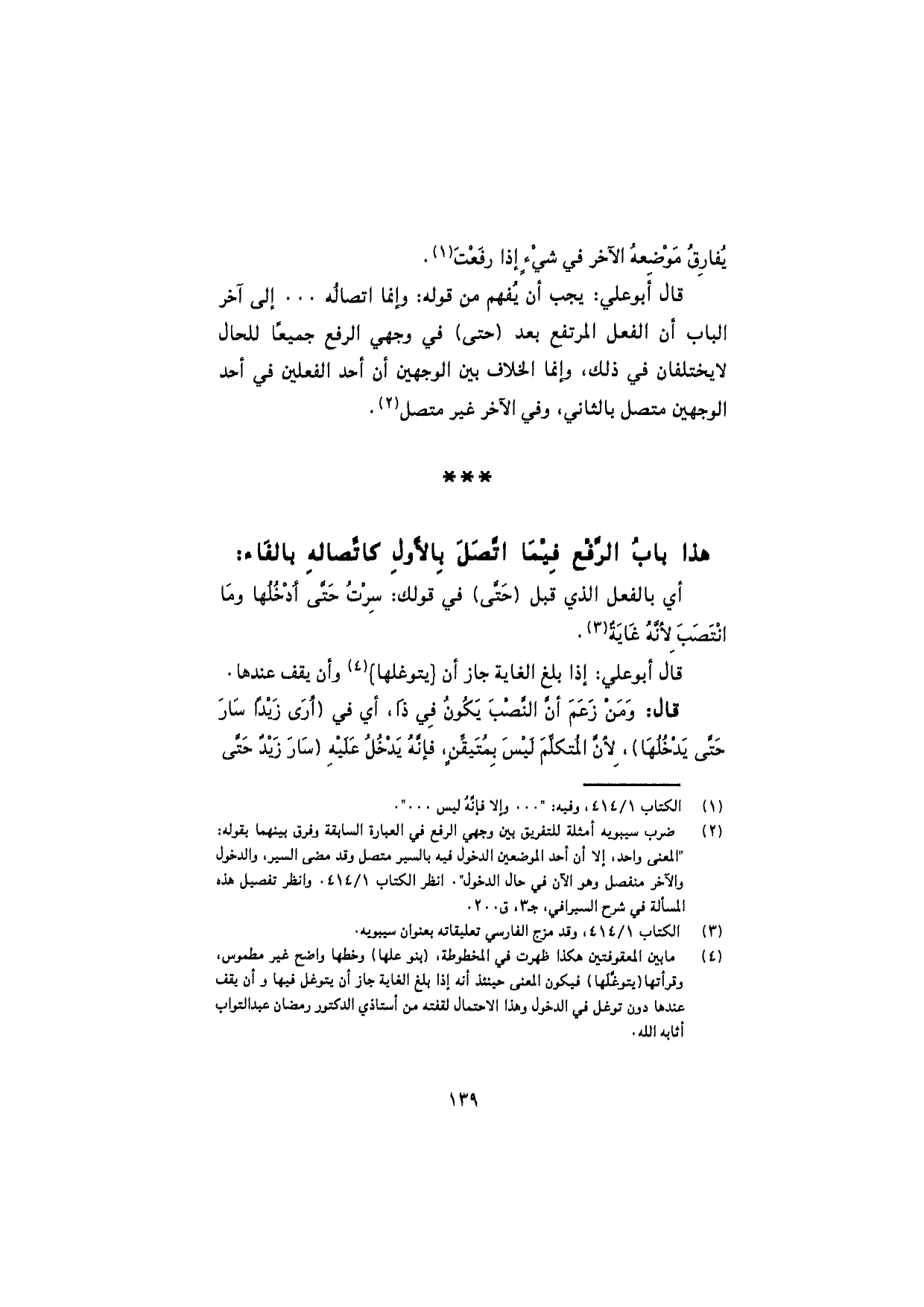 قال أبو علي: يجب أن يُفهم من قوله: وإنما اتصاله ... إلى آخر الباب أن الفعل المرتفع بعد (حتى) في وجهي الرفع جميعًا للحال لا يختلفان في ذلك، وإنما الخلاف بين الوجهين أن أحد الفعلين في أحد الوجهين متصل بالثاني، وفي الآخر غير متصل.
