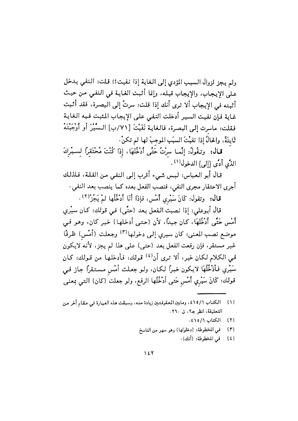 ولم يجز لزوال السبب المؤدي إلى الغاية إذا نفيت؟! قلت: النفي يدخل على الإيجاب، والإيجاب قبله، وإنما أثبت الغاية في النفي من حيث أثبته في الإيجاب ألا ترى أنك إذا قلت: سرتُ إلى البصرة، فقد أثبت غاية فإن نفيت السير أدخلت النفي على الإيجاب المثبت فيه الغاية فقلت: ما سِرت إلى البصرة، فالغاية نَفَيْتَ السَّيْرَ أو أوْجَبْتَهُ ثابِتَةٌ، والحالُ إذا نفيْتَ السببَ الموجبَ لها لم تكنْ.