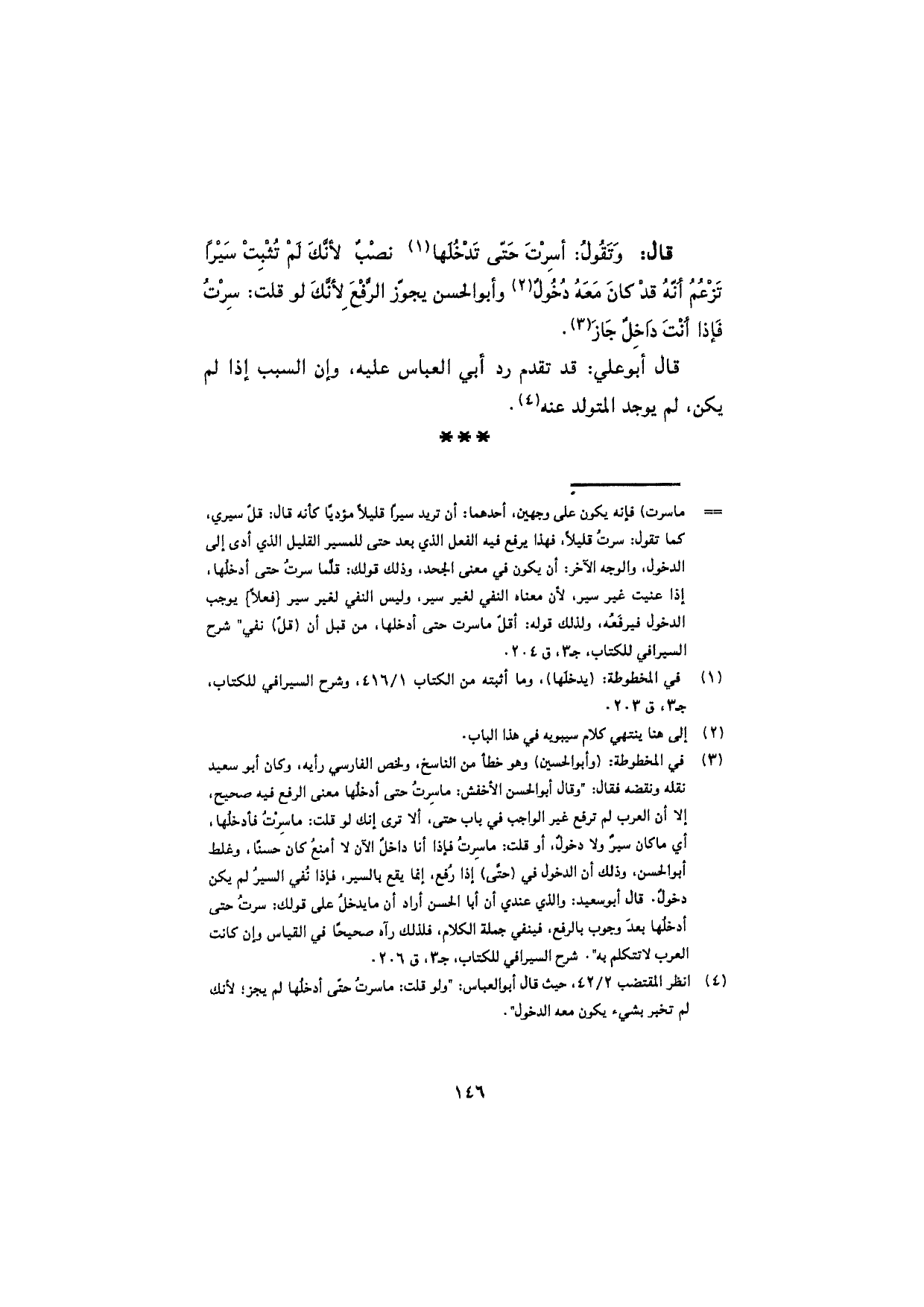 قال: وتقول: أسِرْتَ حتى تدخلَها نصْبٌ لأنّك لم تثبتْ سَيْرًا تَزْعُمُ أنّه قد كان معه دخولٌ وأبو الحسن يجوّز الرّفْعَ لأنّك لو قلت: سِرْتُ فإذا أنت داخلٌ جاز.