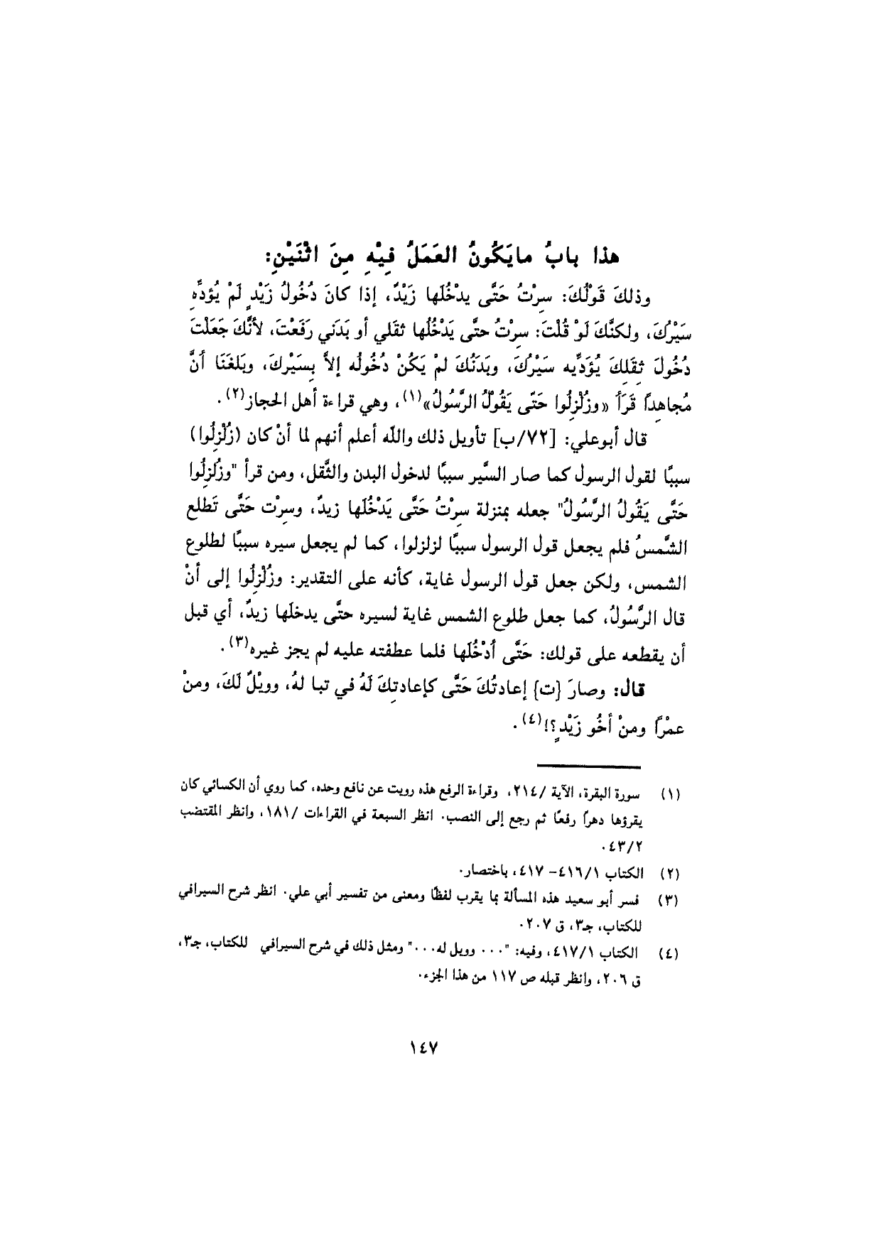 وذلك قولك: سرت حتى يدخلَها زيدٌ، إذا كان دخول زيد لم يُؤَدِّه سَيْرُك، ولكنّك لو قلت: سرتُ حتى يدخلُها ثقَلي أو بدني رَفَعْتَ، لأنّك جعلْت دخولَ ثِقَلِكَ يُؤدّيه سَيْرُكَ، وبَدَنُكَ لم يكن دُخولُه إلاّ بِسَيْرِكَ، وبَلَغَنا أنَّ مُجاهِدًا قَرَأ "وزُلْزلوا حتى يقولُ الرّسولُ"، وهي قراءة أهل الحجاز.