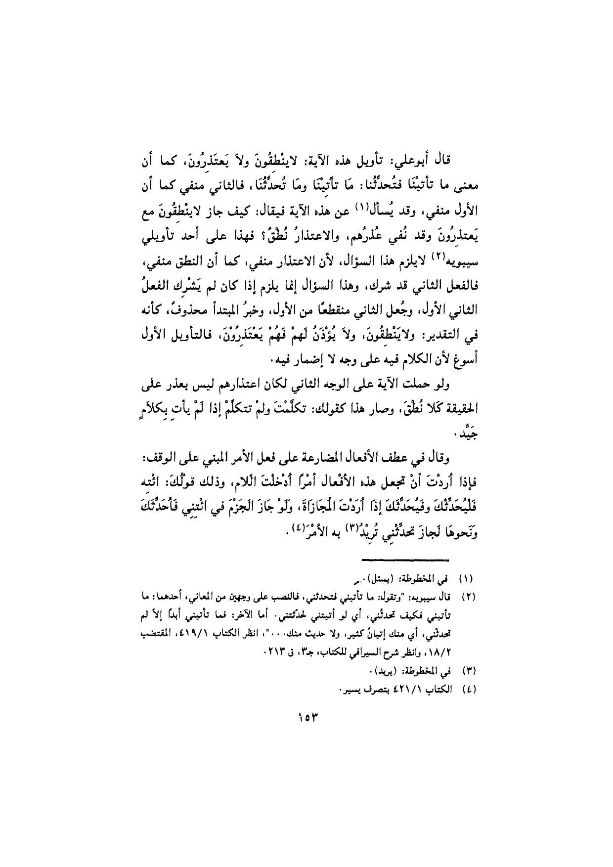 قال أبو علي: تأويل هذه الآية: لا ينطقون ولا يعتذرون، كما أن معنى ما تأتينا فتُحَدّثُنا: ما تأتينا وما تحدثُنا، فالثاني منفي كما أن الأول منفي، وقد يُسأل عن هذه الآية فيُقال: كيف جاز لا ينطقون مع يعتذرون وقد نُفي عُذْرُهم، والاعتذار نُطْقٌ؟ فهذا على أحد تأويلي سيبويه لا يلزم هذا السؤال، لأن الاعتذار منفي، كما أن النطق منفي، فالفعل الثاني قد شرك، وهذا السؤال إنما يلزم إذا كان لم يَشْرِكْ الفعلُ الثاني الأول، وجُعل الثاني منقطعًا من الأول، وخبرُ المبتدأ محذوفٌ، كأنه في التقدير: ولا ينطقون، ولا يُؤذن لهم فهم يعتذرون، فالتأويل الأول أسوغ لأن الكلام فيه على وجه لا إضمار فيه.