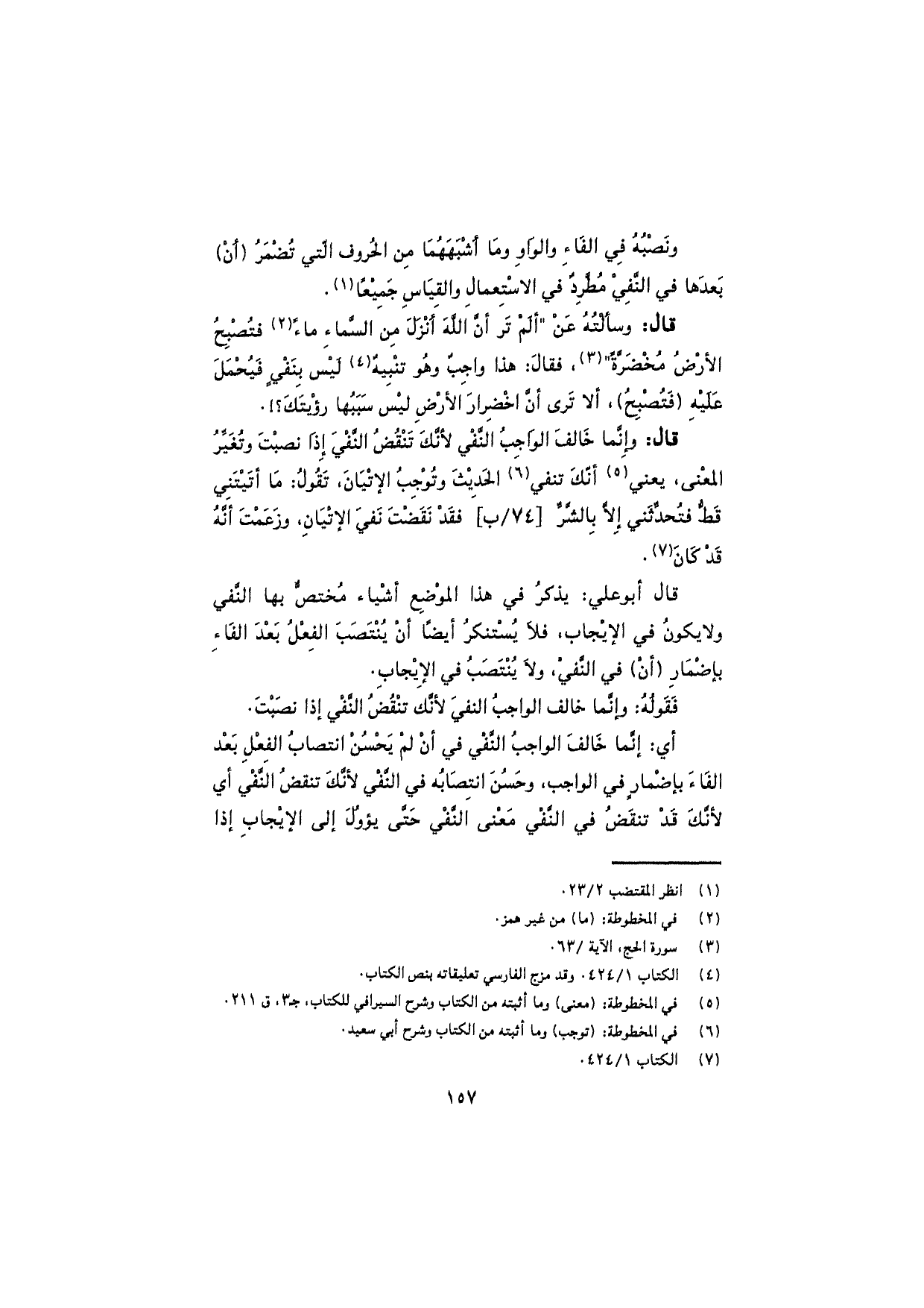 قال: وإنّما خالف الواجبُ النّفي لأنك تنقُضُ النّفيَ إذا نَصَبْتَ وتُغَيّرُ المعنى، يعني أنّك تنفي الحديثَ وتوجِبُ الإتيانَ، تقول: ما أتيتني قَطُّ فتُحدِّثَني إلا بالشَّرِّ فقد نَقَضْتَ نَفي الإتيان، وزعمْتَ أنّه قد كان.