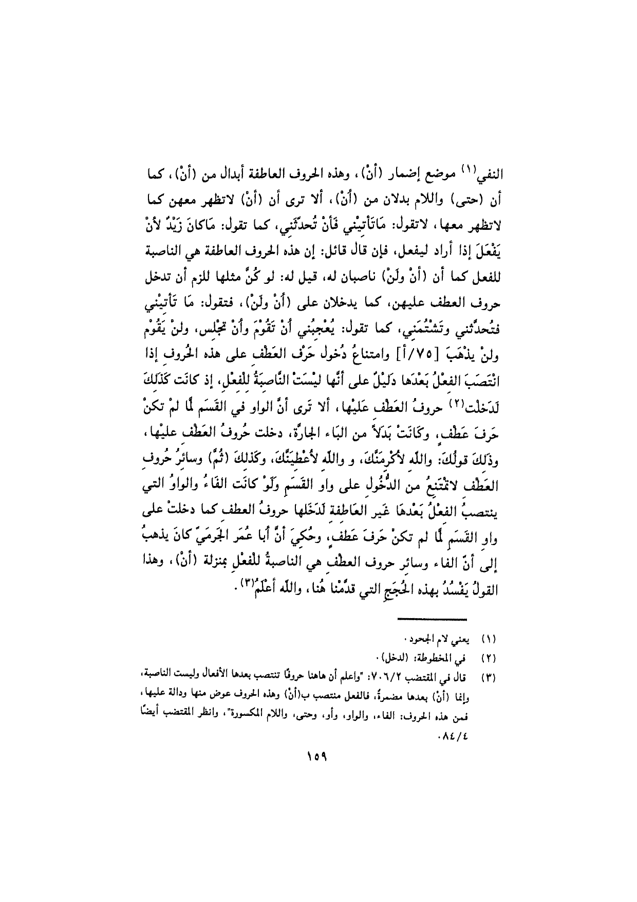 النفي موضع إضمار (أنْ)، وهذه الحروف العاطفة أبدال من (أنْ)، كما أن (حتى) واللام بدلان من (أنْ)، ألا ترى أن (أنْ) لا تظهر معهم كما لا تظهر معها، لا تقول: ما تأتيني فأنْ تُحدثَني، كما تقول: "ما كان زيدٌ لأن يفعلَ إذا أراد ليفعل، فإن قال قائل: إن هذه الحروف العاطفة هي الناصبة للفعل كما أن (أنْ ولن) ناصبان له، قيل له: لو كُنَّ مثلها للزم أن تدخل حروف العطف عليهن، كما يدخلان على (أن ولن)، فتقول: ما تأتيني فتُحدثني وتشتُمَني، كما تقول: يُعجبني أن تقومَ وأن تجلس، ولنْ يقوم ولن يذهبَ وامتناعُ دخول حرف العطف على هذه الحروف إذا انتصب الفعل بعدها دليلٌ على أنها ليست الناصبةُ للفعلِ، إذ كانت كذلك لدخلت حروف العطف عليها، ألا ترى أنَّ الواو في القَسَم لَمّا لم تكن حرفَ عطف، وكانت بدلاً من الباء الجارّة، دخلت حروف العطف عليها، وذلك قولُك: والله لأكرمنّك، ووالله لأعطينَّك، وكذلك (ثُمَّ) وسائرُ حروف العطف لا تمتنع من الدخول على واو القسم ولو كانت الفاء والواو التي ينتصب الفعل بعدها غير العاطفة لدخلها حروف العطف كما دخلت على واو القسم لَمّا لم تكن حرفَ عطف، وحُكِيَ أنَّ أبا عمر الجَرمي كان يذهب إلى أنّ الفاء وسائر حروف العطف هي الناصبة للفعل بمنزلة (أنْ)، وهذا القولُ يَفْسُدُ بهذه الحُجَجِ التي قَدَّمْنا هنا، والله أعلمُ.