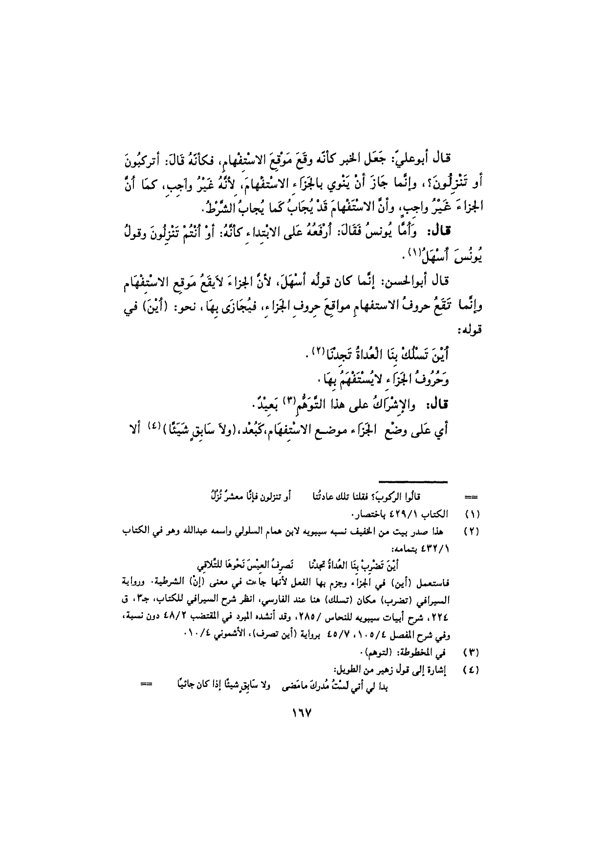 قال أبو الحسن: إنّما كان قولُه أسهلَ، لأنَّ الجزاءَ لا يقعُ موقع الاستفهام وإنّما تقع حروفُ الاستفهام مواقعَ حروف الجزاء، فيُجازى بها، نحو: (أين) في قوله: