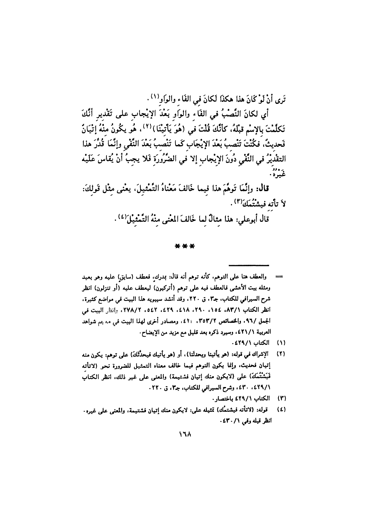 أي لكان النَّصْبُ في الفاء والواو بعد الإيجاب على تقدير أنّك تَكَلَّمْتَ بالاسم قبلَه، كأنّك قلت في (هو يَاتِينا)، هو يكون منه إتيانٌ فَحديثٌ، فكُنْتَ تنصِبُ بعد الإيجاب كما تنصب بعد النّفي وإنّما قُدِّرَ هذا التَّقديرُ في النّفي دون الإيجاب إلا في الضرورة فلا يجبُ أن يُقاس عليه غَيْرُهُ.