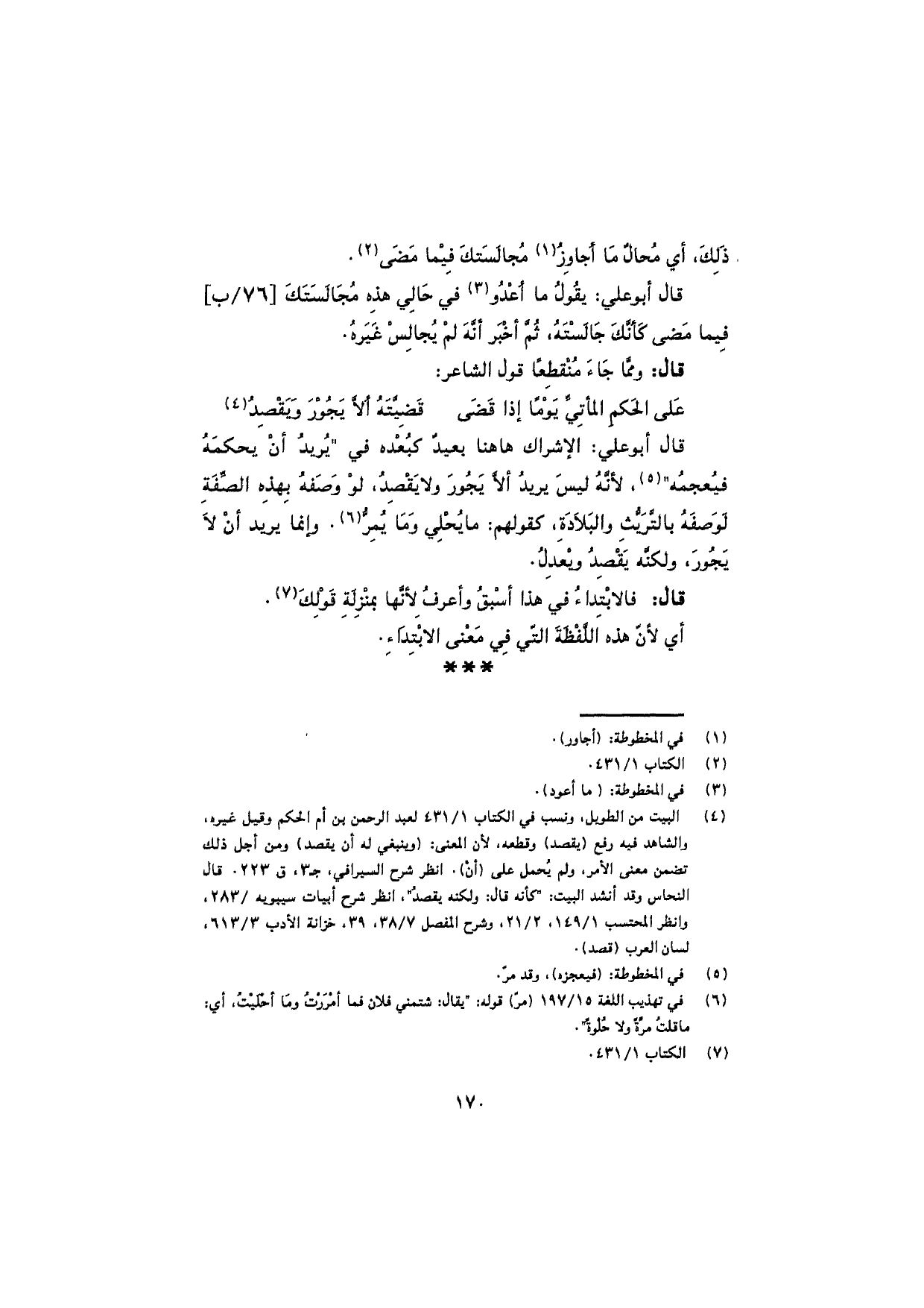 قال أبو علي: الإشراك هاهنا بعيدٌ كبُعده في "يريد أنْ يحكمَهُ فيُعجمُه"، لأنّه ليس يريد ألاّ يجورَ ولا يقصدُ، لوْ وَصَفَهُ بهذه الصّفة لَوَصَفَه بالتَّرَيُّثِ والبلادةِ، كقولهم: ما يُحْلي وما يُمِرُّ. وإنما يريد أنْ لا يجورَ، ولكنّه يَقْصِدُ ويعدِلُ.