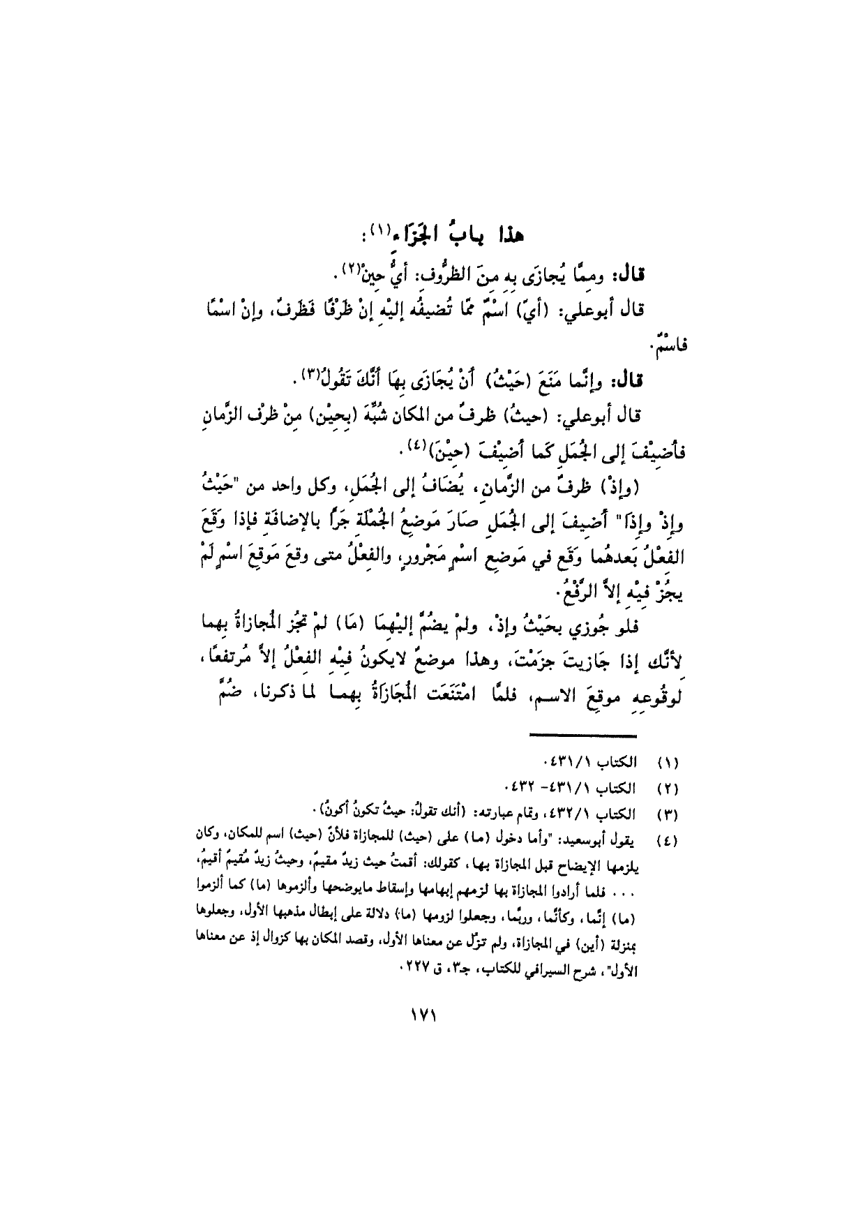 قال أبو علي: (حيثُ) ظرفٌ من المكان شُبِّهَ (بحين) مِنْ ظرفِ الزَّمانِ فأضِيفَ إلى الجُمَل كما أضيفَ (حين).