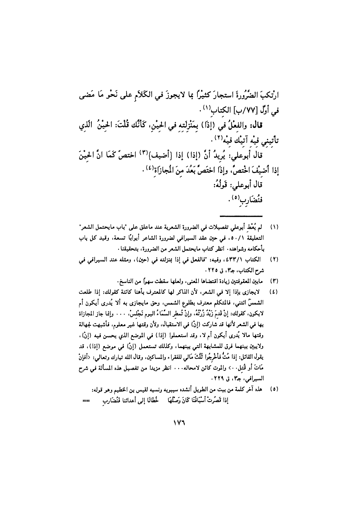 قال أبو علي: يريد أنّ (إذا) إذا {أضيف} اختصّ كما أنّ الحينَ إذا أضيف اختصّ، وإذا اختصّ بَعُدَ من المجازاة.