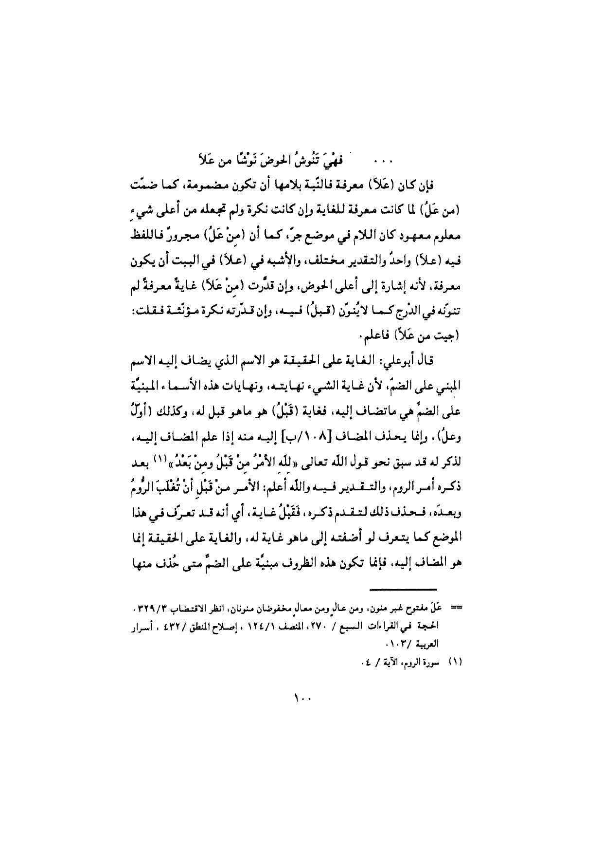 فإن كان (عَلا) معرفة فالنِّية بلامها أن تكون مضمومة، كما ضمّت (من عَلُ) لما كانت معرفة للغاية وإن كانت نكرة ولم تجعله من أعلى شيء معلوم معهود كان اللام في موضع جرّ، كما أن (مِنْ عَلُ) مجرورٌ فاللفظ فيه (علا) واحدٌ والتقدير مختلف، والأشبه في (عَلا) في البيت أن يكون معرفة، لأنه إشارة إلى أعلى الحوض، وإن قدَّرت (منْ عَلا) غايةً معرفةً لم تنوّنه في الدّرج كما لا يُنوّن (قبلُ) فيه، وإن قدّرته نكرة مؤنثة فقلت: (جيت من عَلاً) فاعلم.