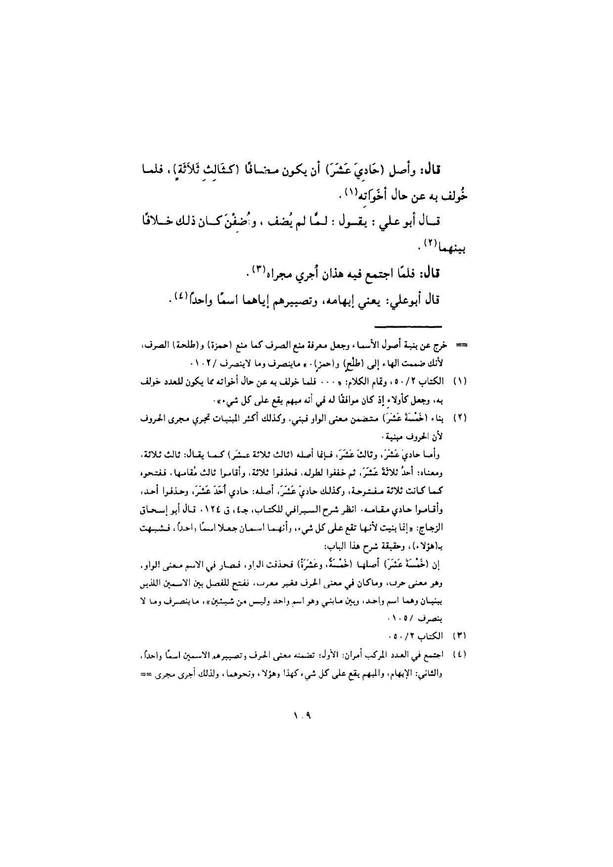 قال: وأصل (حادِيَ عَشَرَ) أن يكون مضافًا (كثالِثِ ثلاثةٍ)، فلما خُولِفَ به عن حال أخواتِه.