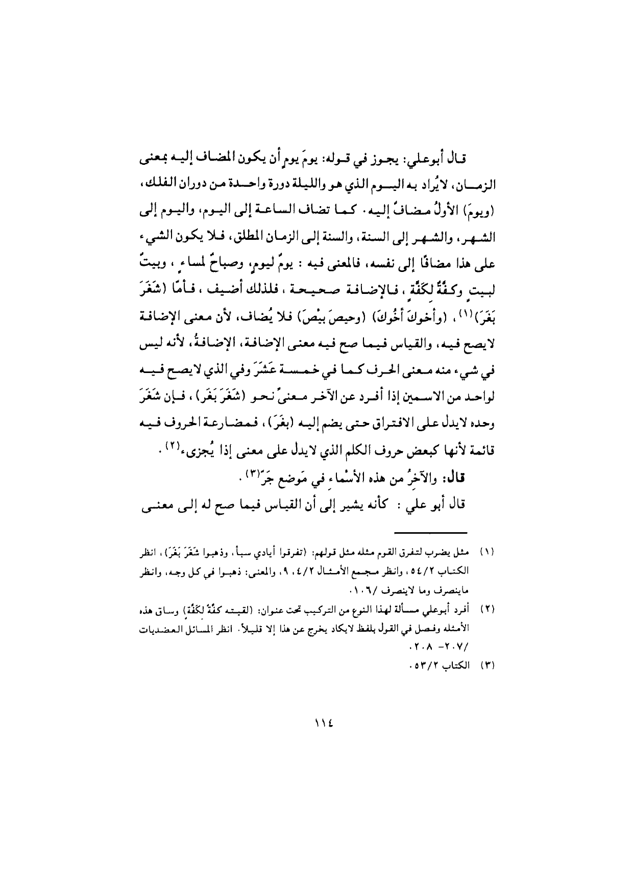 قال أبو علي: يجوز في قوله: يومَ يومٍ أن يكون المضاف إليه بمعنى الزمان، لا يُراد به اليوم الذي هو والليلة دورة واحدة من دوران الفلك، (ويومَ) الأوّلُ مضافٌ إليه. كما تضاف الساعة إلى اليوم، واليوم إلى الشهر، والشهر إلى السنة، والسنة إلى الزمان المطلق، فلا يكون الشيء على هذا مضافًا إلى نفسه، فالمعنى فيه: يومٌ ليومٍ، وصباحٌ لمساءٍ، وبيتٌ لبيتٍ وكفَّةٌ لِكَفَّةٍ، فالإضافة صحيحة، فلذلك أضيف، فأمّا (شَغَرَ بَغَرَ)، (وأخوكَ أخوكَ) (وحيصَ بيْصَ) فلا يُضاف، لأن معنى الإضافة لا يصح فيه، والقياس فيما صح فيه معنى الإضافة، الإضافةُ، لأنه ليس في شيء منه معنى الحرف كما في خمسة عَشَرَ وفي الذي لا يصح فيه لواحد من الاسمين إذا أفرد عن الآخر معنىً نحو (شَغَرَ بَغَر)، فإن شَغَرَ وحده لا يدل على الافتراق حتى يضم إليه (بَغَرَ)، فمضارعة الحروف فيه قائمة لأنها كبعض حروف الكلم الذي لا يدل على معنى إذا يُجزئ.