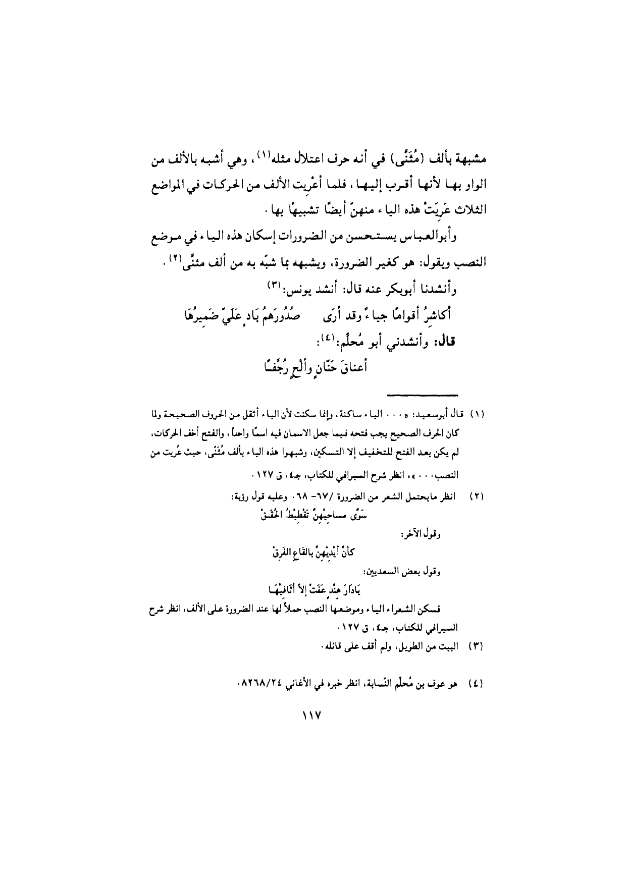 وأبو العباس يستحسن من الضرورات إسكان هذه الياء في موضع النصب ويقول: هو كغير الضرورة، ويشبهه بما شبّه به من ألف مثنَّى.