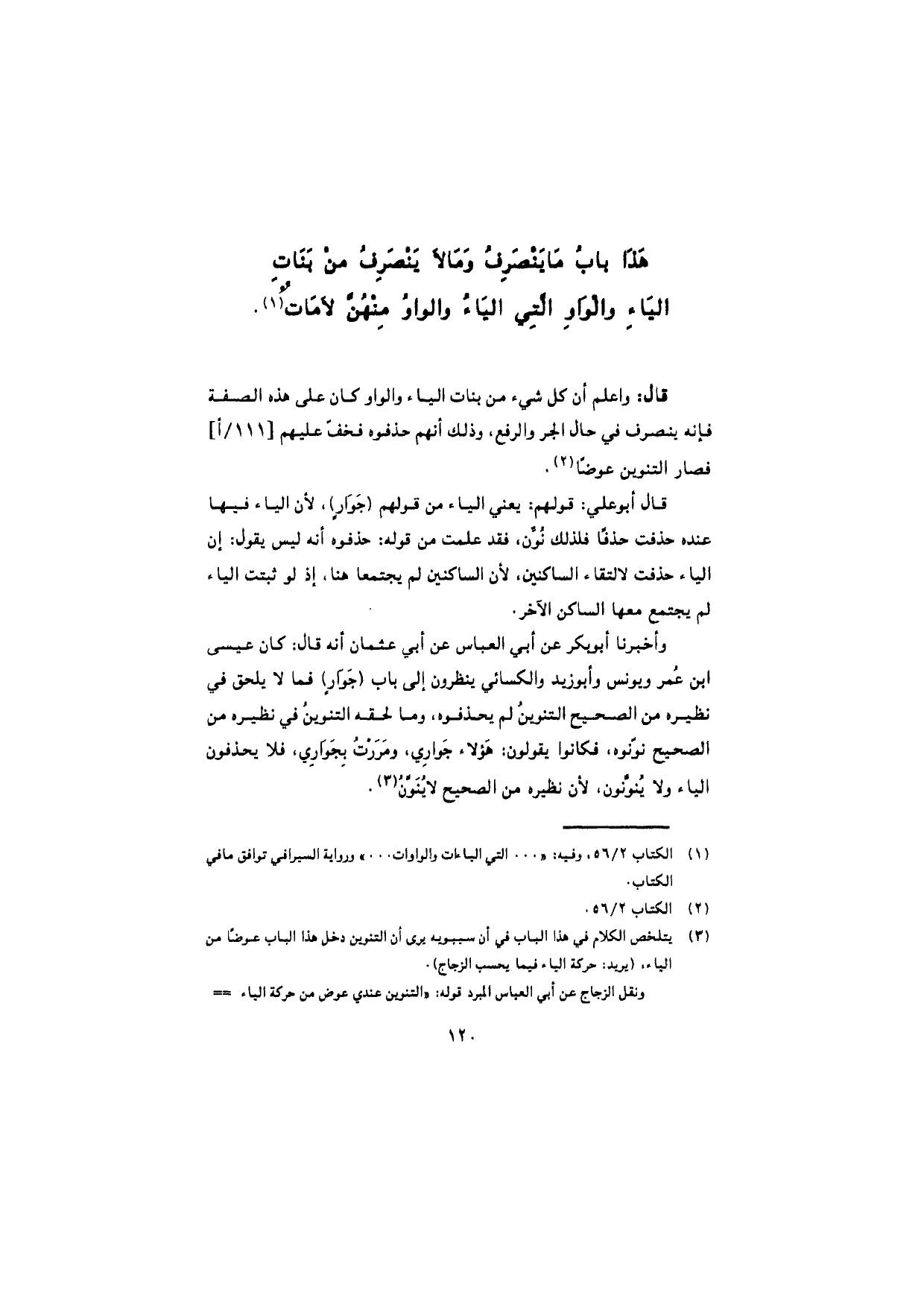 وأخبرنا أبو بكر عن أبي العباس عن أبي عثمان أنه قال: كان عيسى بن عُمر ويونس وأبو زيد والكسائي ينظرون إلى باب (جَوارٍ) فما لا يلحق في نظيره من الصحيح التنوينُ لم يحذفوه، وما لحقه التنوينُ في نظيره من الصحيح نوّنوه، فكانوا يقولون: هَؤلاء جَواري، ومَرَرْتُ بجواري، فلا يحذفون الياء ولا يُنوِّنون، لأن نظيره من الصحيح لا يُنَوَّنُ.