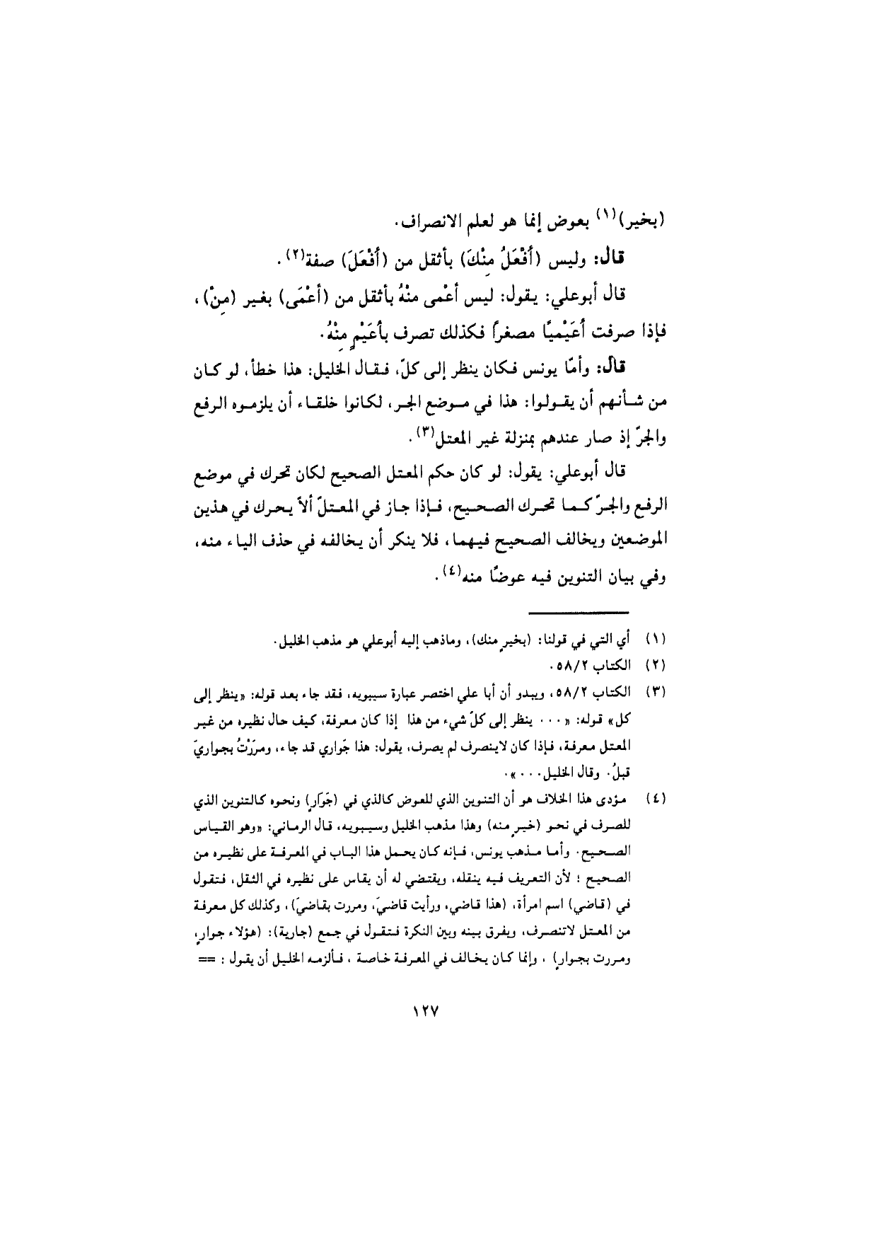 قال: وأمّا يونس فكان ينظر إلى كلّ، فقال الخليل: هذا خطأ، لو كان من شأنهم أن يقولوا، هذا في موضع الجر، لكانوا خلقاء أن يلزموه الرفع والجرّ إذ صار عندهم بمنزلة غير المعتل.