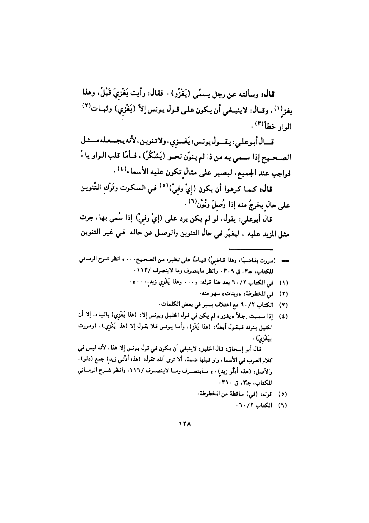 قال: وسألته عن رجل يسمّى (يَغْزُو)، فقال: رأيت يَغْزِيَ قبلُ، وهذا يغزٍ، وقال: لا ينبغي أن يكون على قول يونس إلاّ (يَغْزِي) وثبات الواو خطأ.