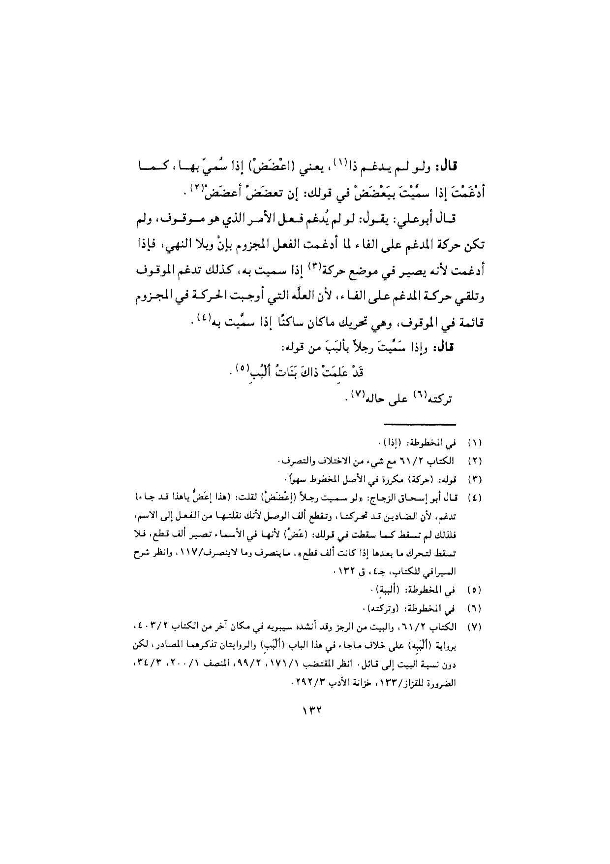 قال أبو علي: يقول: لو لم يُدغم فعل الأمر الذي هو موقوف، ولم تكن حركة المدغم على الفاء لما أدغمت الفعل المجزوم بإنْ وبلا النهي، فإذا أدغمت لأنه يصير في موضع حركة إذا سميت به، كذلك تدغم الموقوف وتلقي حركة المدغم على الفاء، لأن العلَّة التي أوجبت الحركة في المجزوم قائمة في الموقوف، وهي تحريك ما كان ساكنًا إذا سمَّيت به.