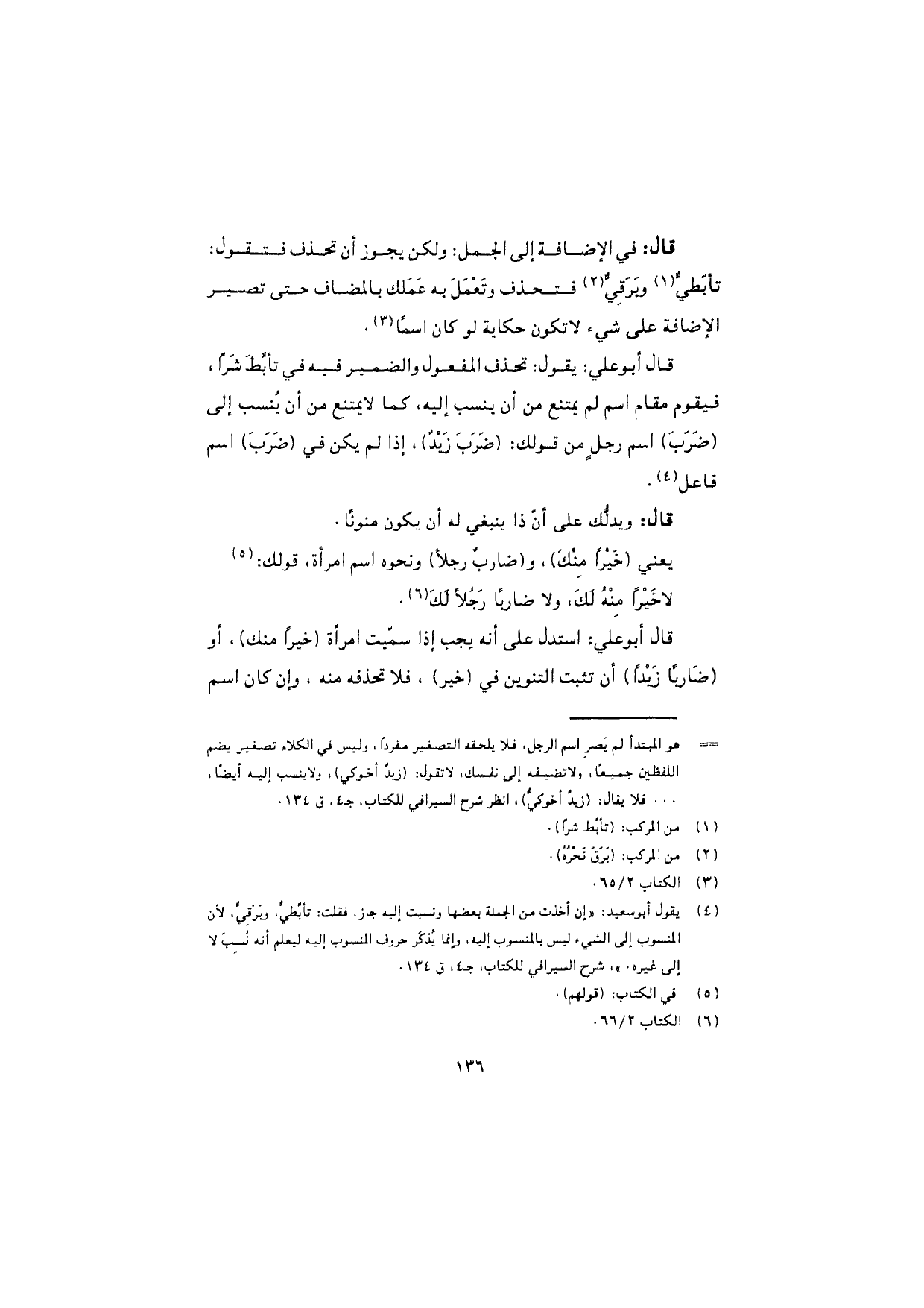 قال: في الإضافة إلى الجمل: ولكن يجوز أن تحذف فتقول: تأبّطيٌّ وبَرَقِيٌّ فتحذف وتَعْمَلَ به عملك بالمضاف حتى تصير الإضافة على شيء لا تكون حكاية لو كان اسمًا.