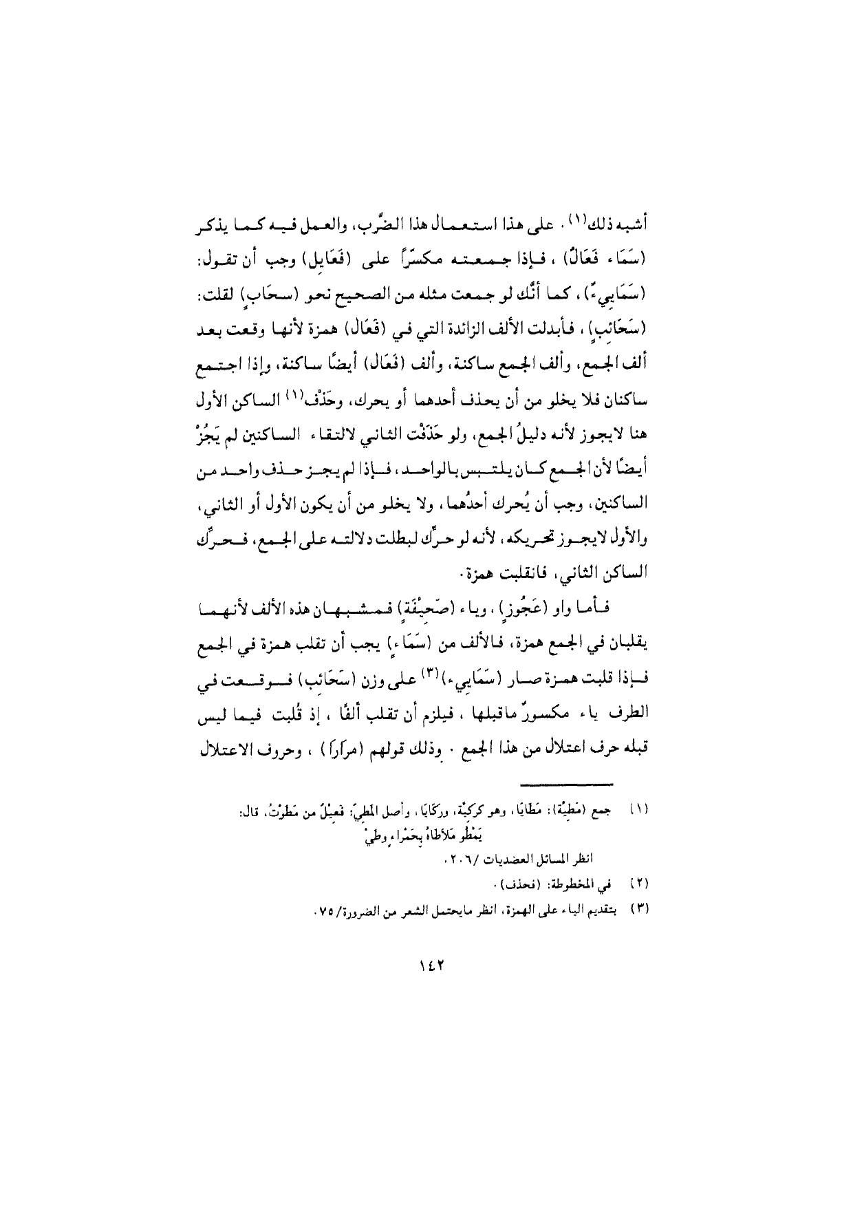 أشبه ذلك. على هذا استعمال هذا الضّرب، والعمل فيه كما يذكر (سَماء فَعالٌ)، فإذا جمعته مكسّرًا على (فَعايِل) وجب أن تقول: (سَماييءٌ)، كما أنّك لو جمعت مثله من الصحيح نحو (سَحابٍ) لقلت: (سَحائِبٍ)، فأبدلت الألف الزائدة التي في (فَعال) همزة لأنها وقعت بعد ألف الجمع، وألف الجمع ساكنة، وألف (فَعال) أيضًا ساكنة، وإذا اجتمع ساكنان فلا يخلو من أن يحذف أحدهما أو يحرك، وحذْف الساكن الأول هنا لا يجوز لأنه دليلُ الجمع، ولو حَذَفْتَ الثاني لالتقاء الساكنين لم يَجُزْ أيضًا لأن الجمع كان يلتبس بالواحد، فإذا لم يجز حذف واحد من الساكنين، وجب أن يُحرك أحدُهما، ولا يخلو من أن يكون الأول أو الثاني، والأول لا يجوز تحريكه، لأنه لو حرِّك لبطلت دلالته على الجمع، فحرِّك الساكن الثاني، فانقلبت همزة.