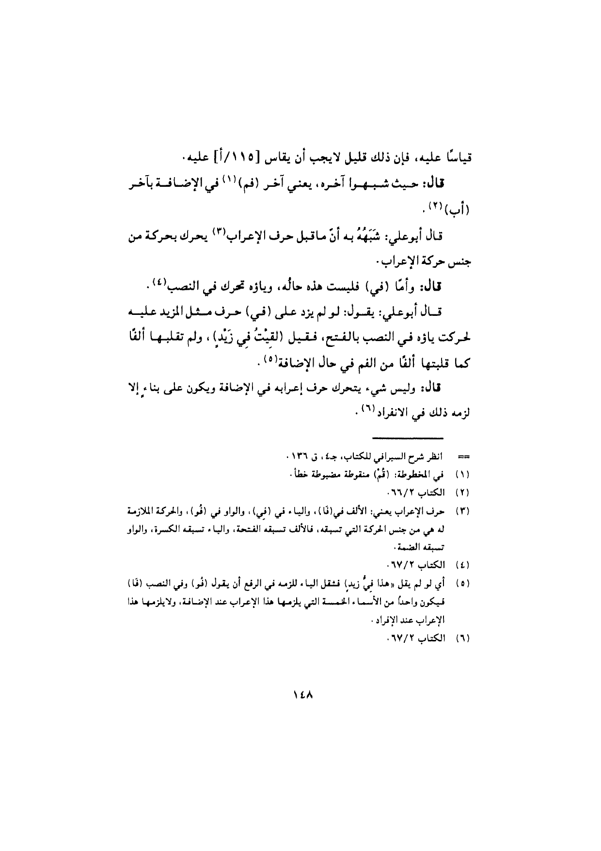 قال أبو علي: يقول: لو لم يزد على (في) حرف مثل المزيد عليه لحركت ياؤه في النصب بالفتح، فقيل (لقيتُ في زيدٍ)، ولم تقلبها ألفًا كما قلبتها ألفًا من الفم في حال الإضافة.