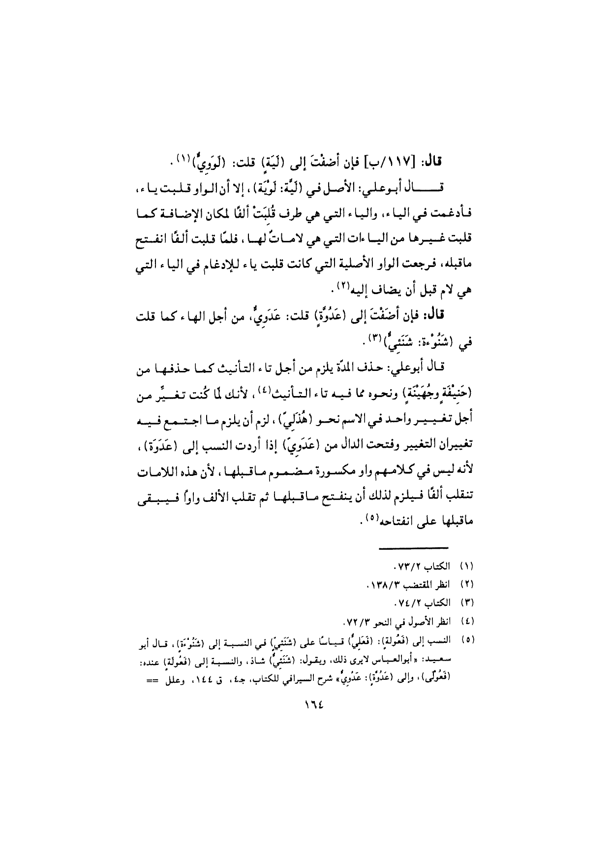 قال: فإن أضَفْتَ إلى (عَدُوَّةٍ) قلت: عَدَوِيٌّ، من أجل الهاء كما قلت في (شَنُوءَة: شَنَئِيٌّ).