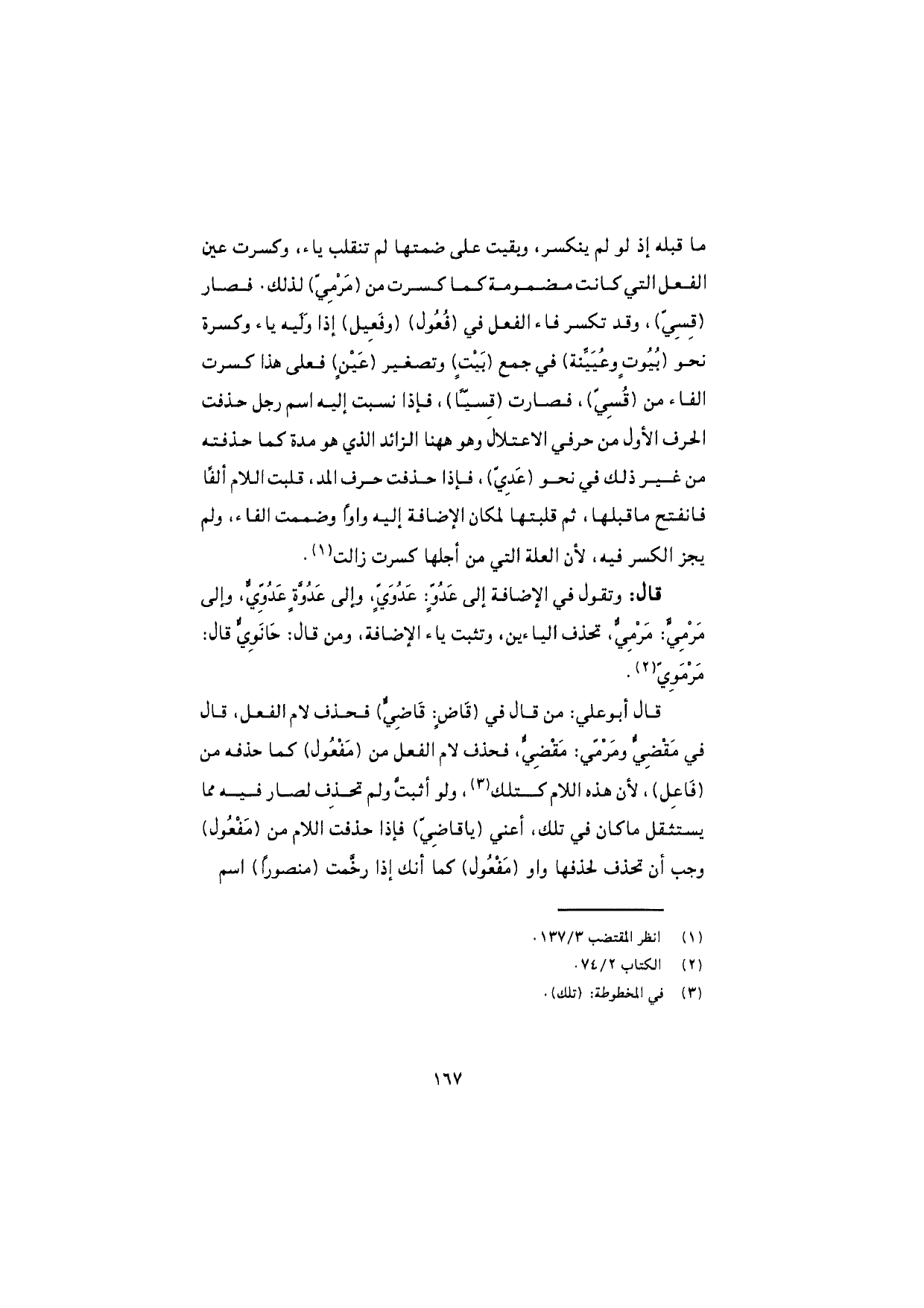 قال: وتقول في الإضافة إلى عَدُوٍّ: عَدُوَيٍّ، وإلى عَدُوَّةٍ عَدُوِّيٌّ، وإلى مَرْمِيّ: مَرْمِيٌّ، تحذف الياءين، وتثبت ياء الإضافة، ومن قال: حانَوِيٌّ قال: مَرْمَوِيّ.