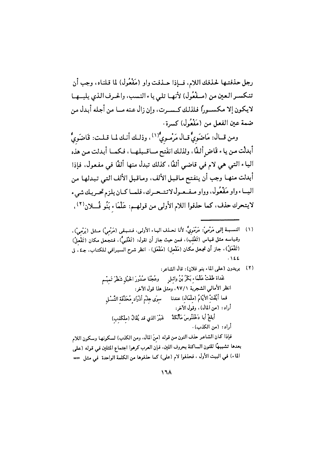 ومن قال: مَاضَوِيٌّ قال مَرْمَوِيٌّ، وذلك أنك لما قلت: قاضَوِيٌّ أبدلْت من ياء قاضٍ ألفًا، ولذلك انفتح ما قبلها، فكما أبدلت من هذه الياء التي هي لام في قاضي ألفًا، كذلك تبدل منها ألفًا في مفعول، فإذا أبدلت منها وجب أن ينفتح ما قبل الألف، وما قبل الألف التي تبدلها من الياء واو مَفْعُول، وواو مفعول لا تتحرك، فلما كان يلزم تحريك شيء لا يتحرك حذف، كما حذفوا اللام الأولى من قولهم: عَلْماءِ بنو فُلان،