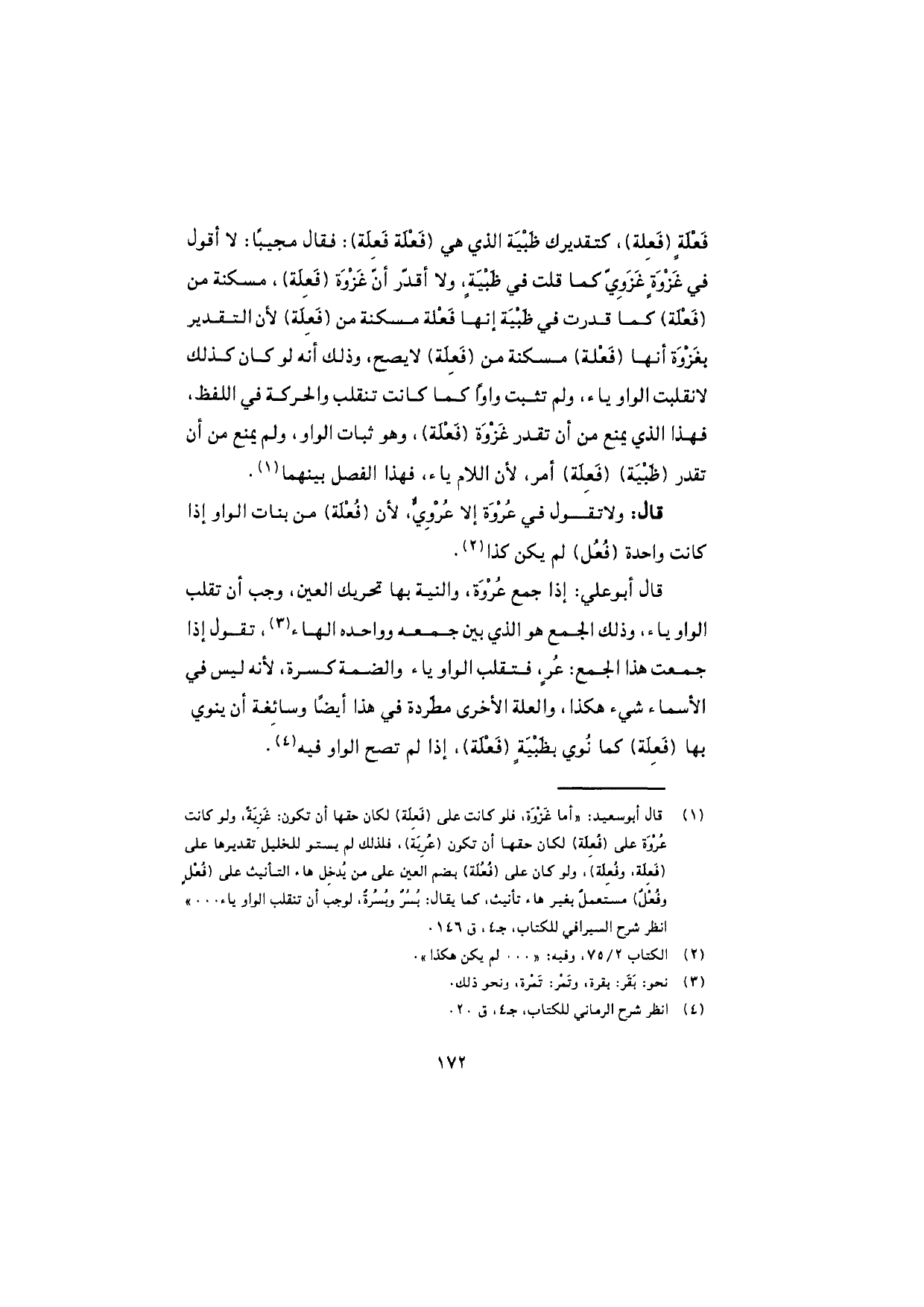 فَعْلَةٍ (فَعِلة)، كتقديرك ظَبْيَة الذي هي (فَعْلَة فَعِلة): فقال مجيبًا: لا أقول في غَزْوَةٍ غَزَوِيّ كما قلت في ظَبْيَةٍ، ولا أقدّر أنّ غَزْوَة (فَعِلَة)، مسكنة من (فَعْلَة) كما قدرت في ظَبْيَة إنها فَعْلَة مسكنة من (فَعِلَة) لأن التقدير بغَزْوَة أنها (فَعْلة) مسكنة من (فَعِلَة) لا يصح، وذلك أنه لو كان كذلك لانقلبت الواو ياء، ولم تثبت واوًا كما كانت تنقلب والحركة في اللفظ، فهذا الذي يمنع من أن تقدر غَزْوَة (فَعْلَة)، وهو ثبات الواو، ولم يمنع من أن تقدر (ظَبْيَة) (فَعِلَة) أمر، لأن اللام ياء، فهذا الفصل بينهما.