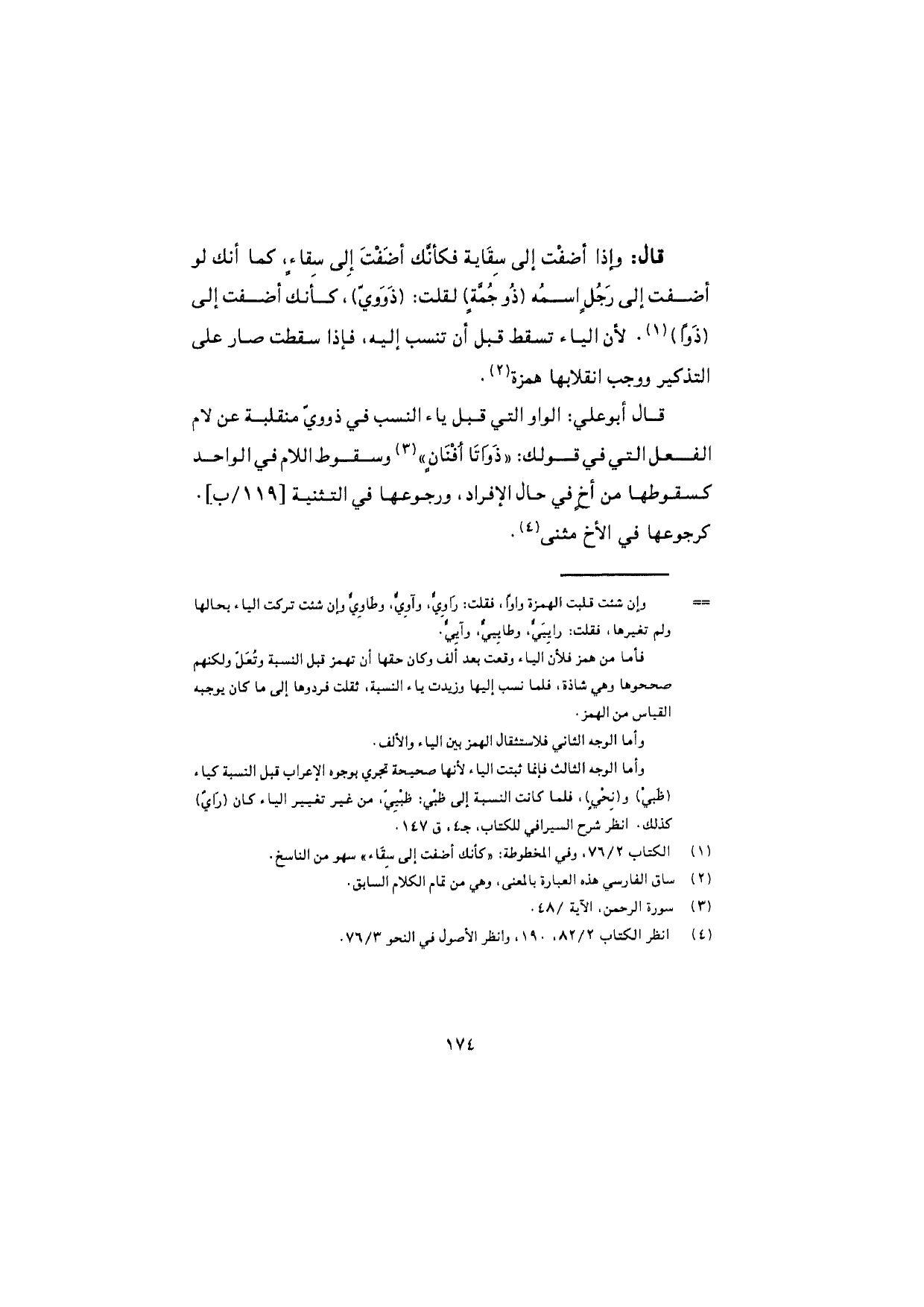 قال: وإذا أضفْت إلى سِقاية فكأنّك أضَفْت إلى سِقاءٍ، كما أنك لو أضفت إلى رَجُلٍ اسمُه (ذُو جُمَّةٍ) لقلت: (ذَوَويّ)، كأنك أضفت إلى (ذَوًا). لأن الياء تسقط قبل أن تنسب إليه، فإذا سقطت صار على التذكير ووجب انقلابها همزة.