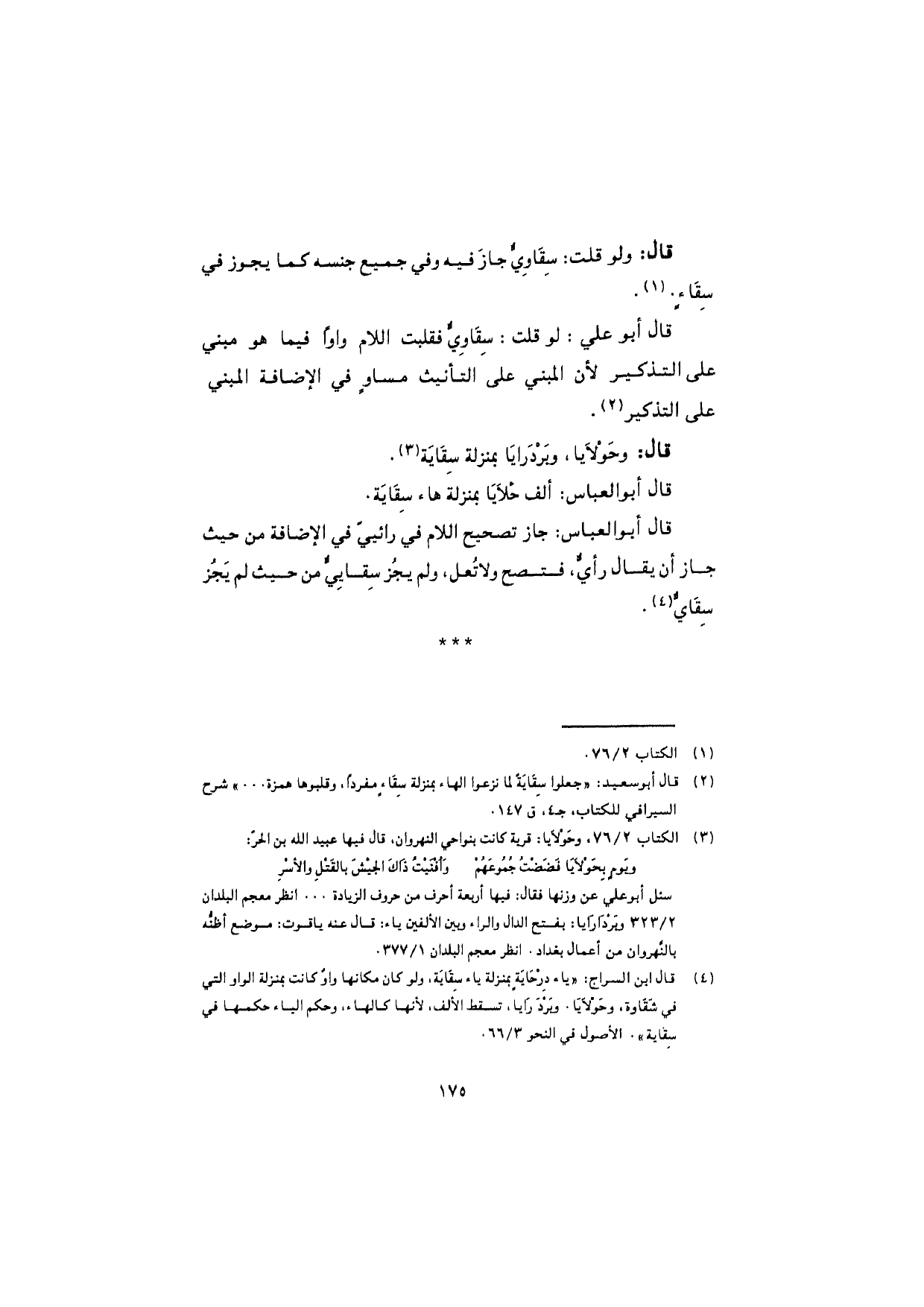 قال أبو علي: لو قلت: سِقاوِيٌّ فقلبت اللام واوًا فيما هو مبني على التذكير لأن المبني على التأنيث مساوٍ في الإضافة المبني على التذكير.