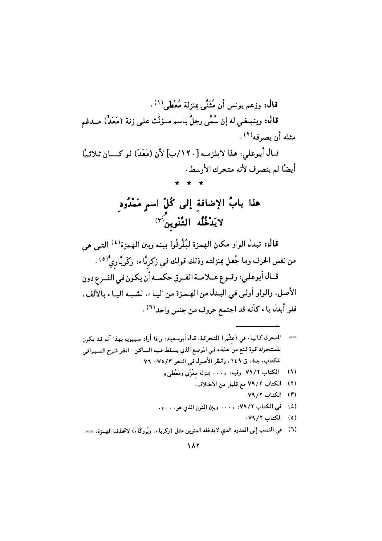 قال: تبدل الواو مكان الهمزة ليُفَرِّقوا بينه وبين الهمزة التي هي من نفس الحرف وما جُعل بمنزلته وذلك قولك في زَكرِيَّاء: زَكَريَّاوِيٌّ.