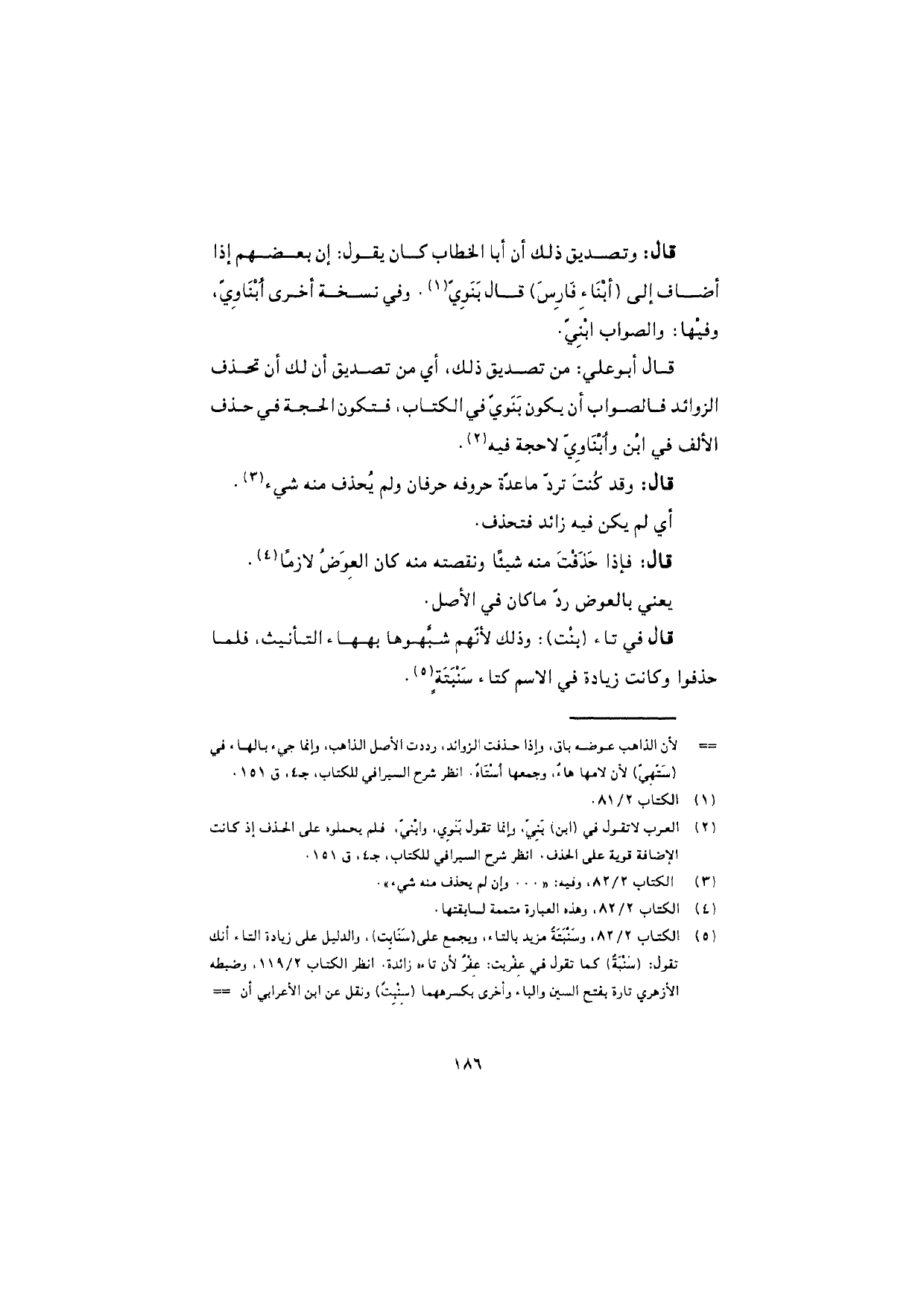 قال: وتصديق ذلك أن أبا الخطاب كان يقول: إن بعضهم إذا أضاف إلى (أبْناءِ فارِسَ) قال بَنَوِيّ. وفي نسخة أخرى أبْناوِيّ، وفيها: والصواب ابْنِيّ.