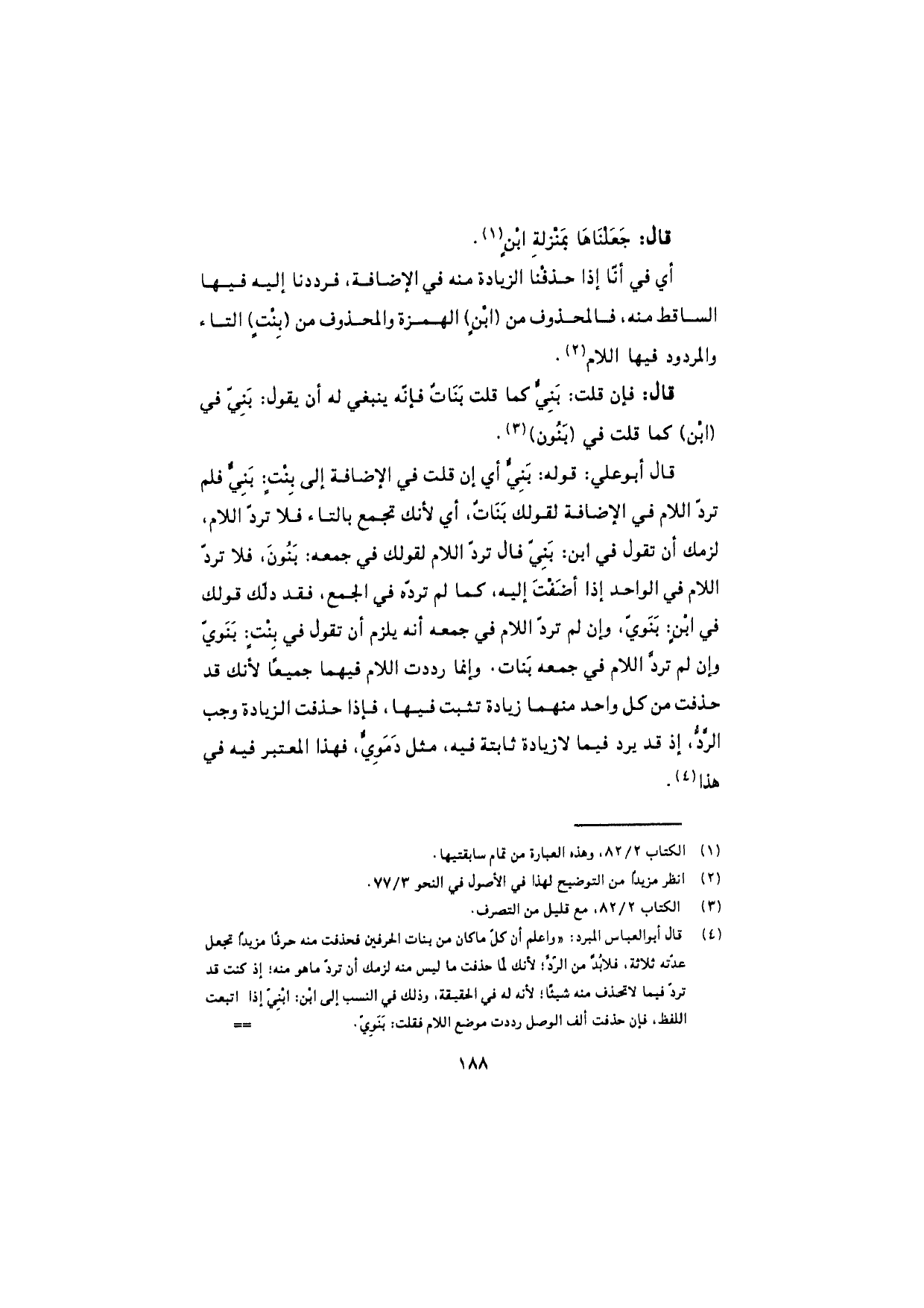 قال أبو علي: قوله: بَنِيٌّ أي إن قلت في الإضافة إلى بنتٍ: بَنِيٌّ فلم تردّ اللام في الإضافة لقولك بناتٌ، أي لأنك تجمع بالتاء فلا تردّ اللام، لزمك أن تقول في ابن: بَنِيّ قال تردّ اللام لقولك في جمعه: بَنونَ، فلا تردّ اللام في الواحد إذا أضَفْتَ إليه، كما لم تردّه في الجمع، فقد دلّك قولك في ابْنٍ: بَنَوِيّ، وإن لم تردّ اللام في جمعه أنه يلزم أن تقول في بِنْتٍ: بَنَويّ وإن لم تردّ اللام في جمعه بنات. وإنما رددت اللام فيهما جميعًا لأنك قد حذفت من كل واحد منهما زيادة تثبت فيها، فإذا حذفت الزيادة وجب الرَّدُّ، إذ قد يرد فيما لا زيادة ثابتة فيه، مثل دَمَوِيٌّ، فهذا المعتبر فيه في هذا.