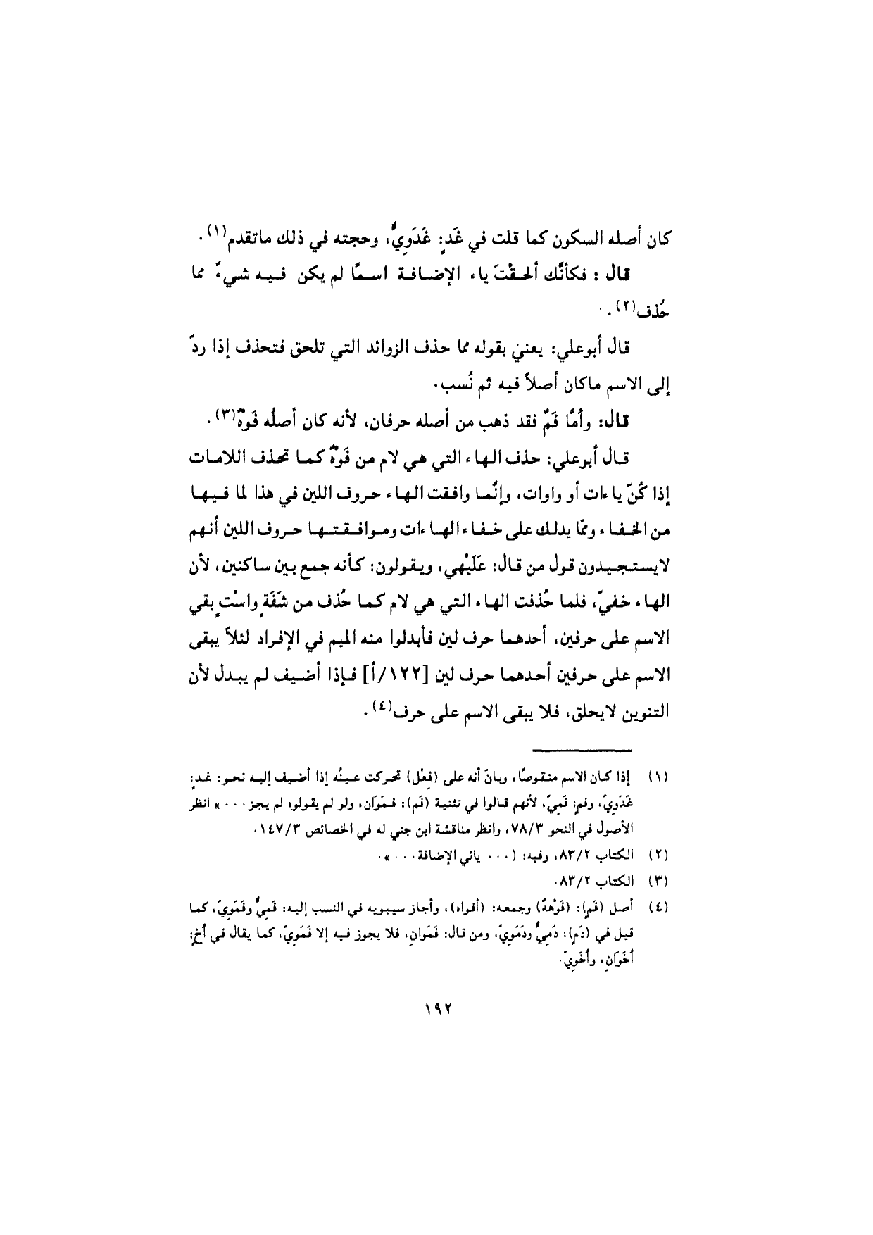 قال أبو علي: حذف الهاء التي هي لام من فَوْهٌ كما تحذف اللامات إذا كُنّ ياءات أو واوات، وإنّما وافقت الهاء حروف اللين في هذا لما فيها من الخفاء ومما يدلك على خفاء الهاءات وموافقتها حرف اللين أنهم لا يستجيدون قول من قال: عَلَيْهي، ويقولون: كأنه جمع بين ساكنين، لأن الهاء خفيّ، فلما حُذفت الهاء التي هي لام كما حُذف من شَفَةٍ واسْتٍ بقي الاسم على حرفين، أحدهما حرف لين فأبدلوا منه الميم في الإفراد لئلاّ يبقى الاسم على حرفين أحدهما حرف لين فإذا أضيف ولم يبدل لأن التنوين لا يلحق، فلا يبقى الاسم على حرف.