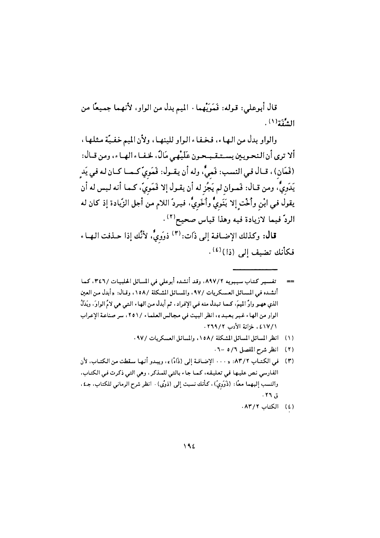 قال: وكذلك الإضافة إلى ذات: ذَوَوِيّ، لأنّك إذا حذفت الهاء فكأنك تضيف إلى (ذا).