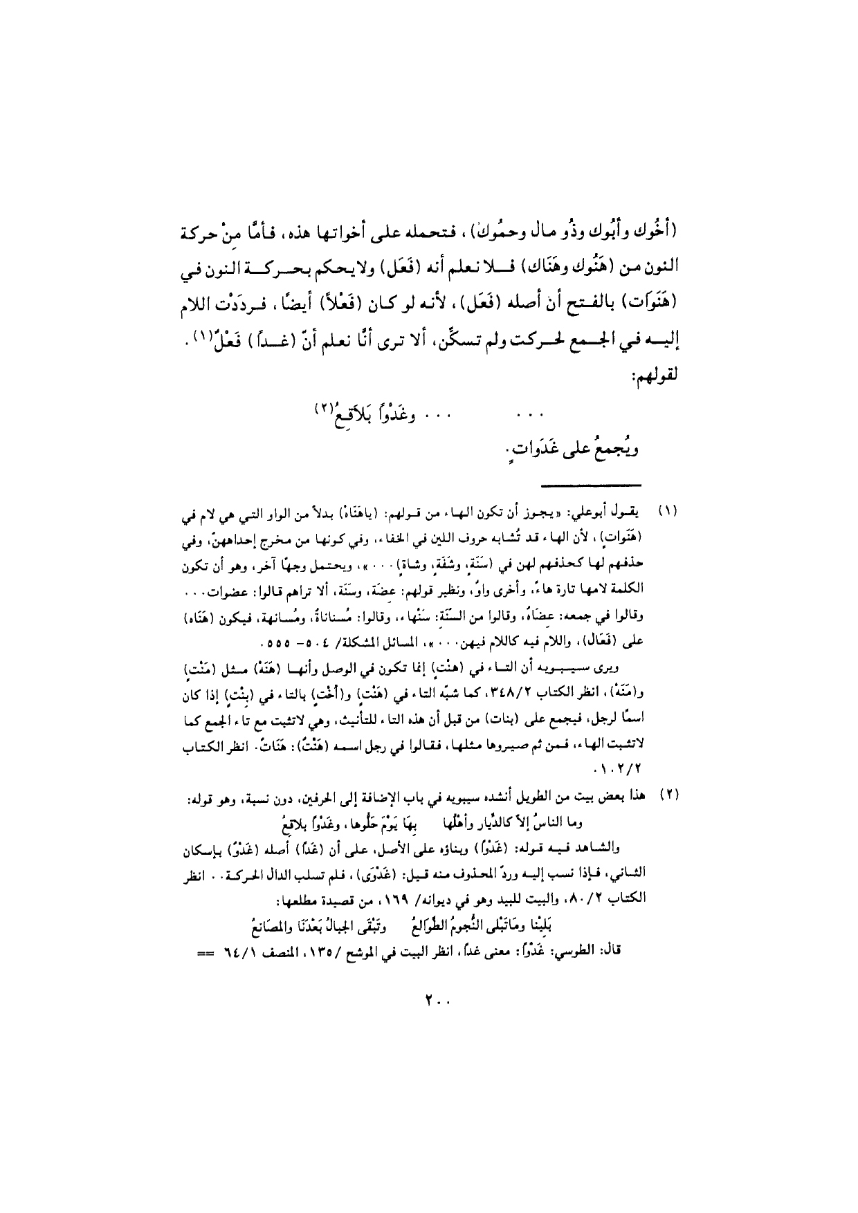 (أخُوك وأبُوك وذو مال وحمُوك)، فتحمله على أخواتها هذه، فأمّا مِنْ حركة النون من (هَنُوك وهَناك) فلا نعلم أنه (فَعَل) ولا يحكم بحركة النون في (هَنَوات) بالفتح أن أصله (فَعَل)، لأنه لو كان (فَعْلاً) أيضًا، فردَدْت اللام إليه في الجمع لحركت ولم تسكِّن، ألا ترى أنّا نعلم أنّ (غدًا) فَعْلٌ. لقولهم: