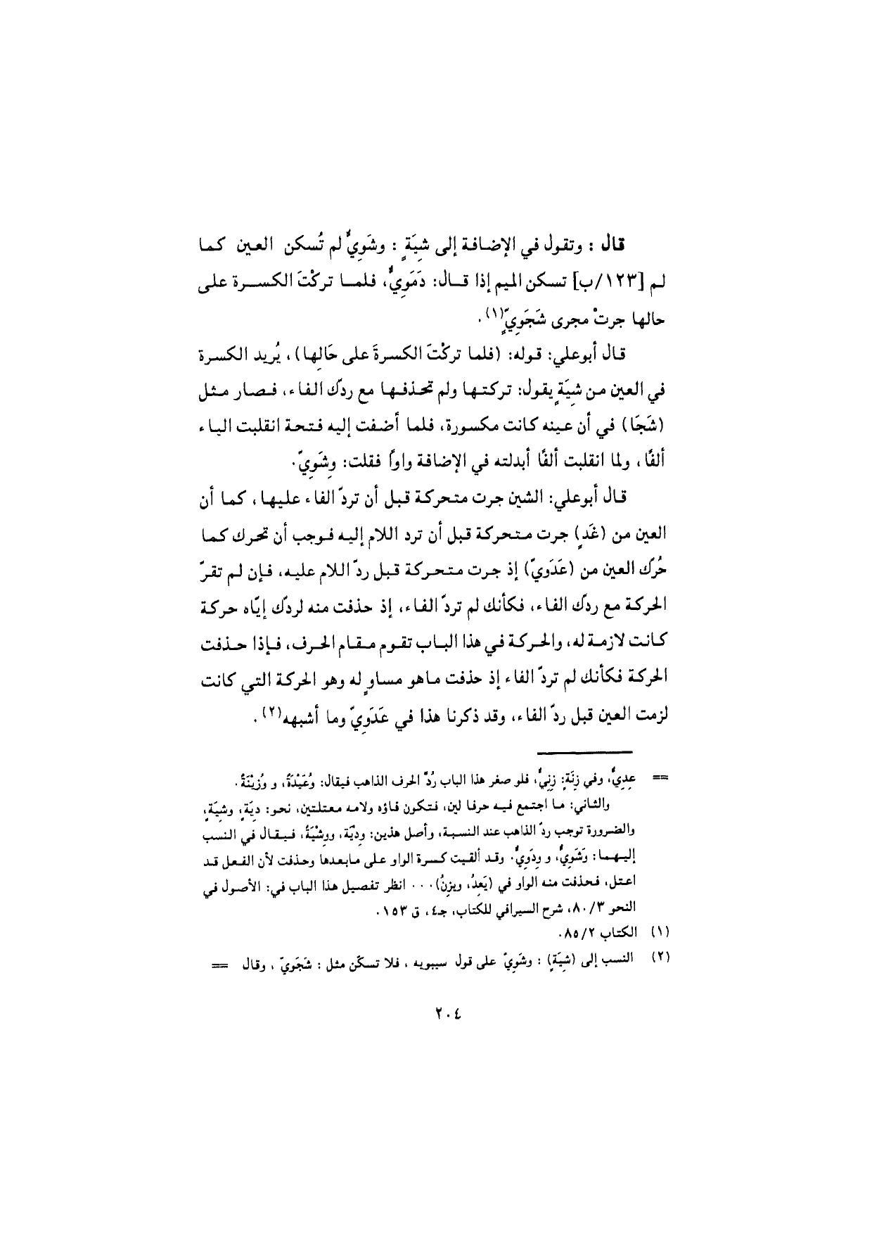 قال أبو علي: الشين جرت متحركة قبل أن تردّ الفاء عليها، كما أن العين من (غَدٍ) جرت متحركة قبل أن ترد اللام إليه فوجب أن تحرك كما حُرّك العين من (عَدَويّ) إذ جرت متحركة قبل ردّ اللام عليه، فإن لم تقرّ الحركة مع ردّك الفاء، فكأنك لم تردّ الفاء، إذ حذفت منه لردّك إيّاه حركة كانت لازمة له، والحركة في هذا الباب تقوم مقام الحرف، فإذا حذفت الحركة فكأنّك لم تردّ الفاء إذ حذفت ما هو مساوٍ له وهو الحركة التي كانت لزمت العين قبل ردّ الفاء، وقد ذكرنا هذا في عَدَوِيّ وما أشبهه.