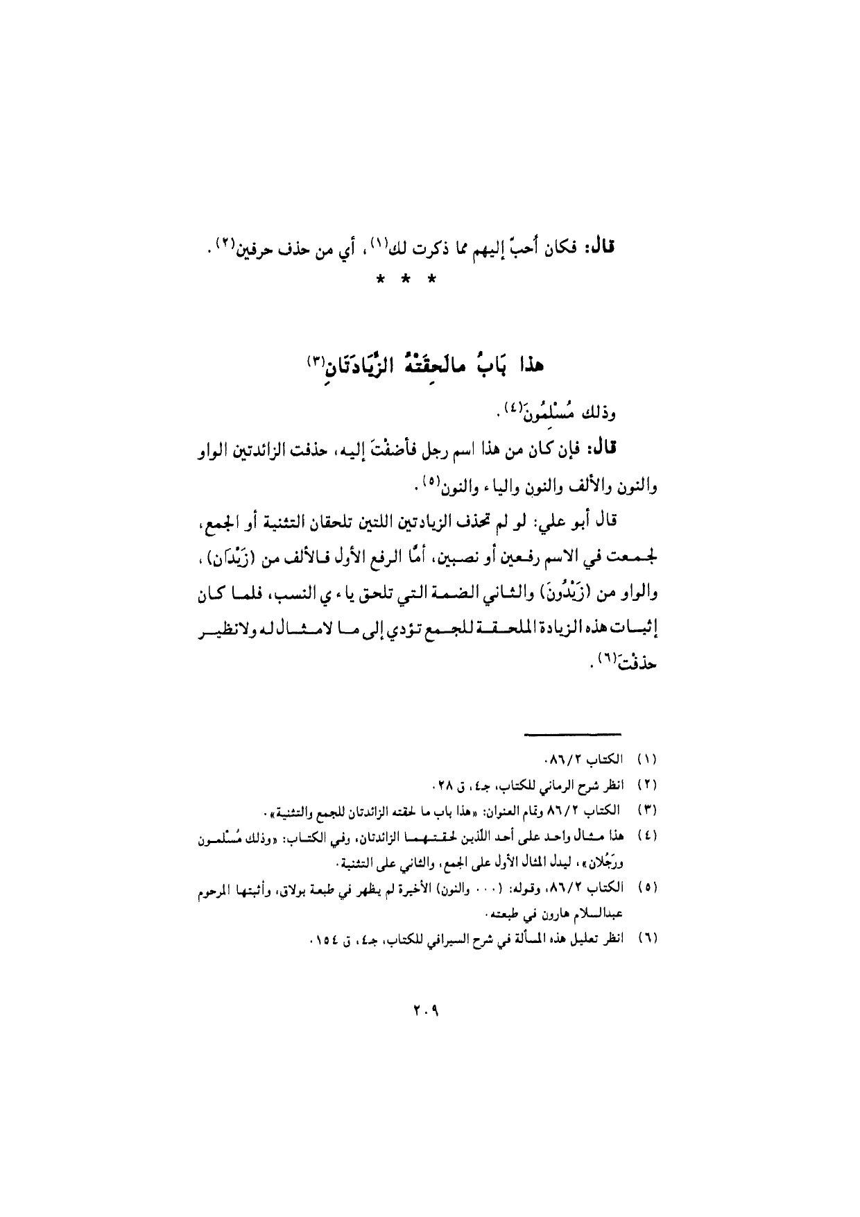 قال أبو علي: لو لم تحذف الزيادتين اللتين تلحقان التثنية أو الجمع، لجمعت في الاسم رفعين أو نصبين، أمّا الرفع الأول فالألف من (زَيْدان)، والواو من (زَيْدُونَ) والثاني الضمة التي تلحق ياءي النسب، فلما كان إثبات هذه الزيادة الملحقة للجمع تؤدي إلى ما لا مثال له ولا نظير حذفْتَ.