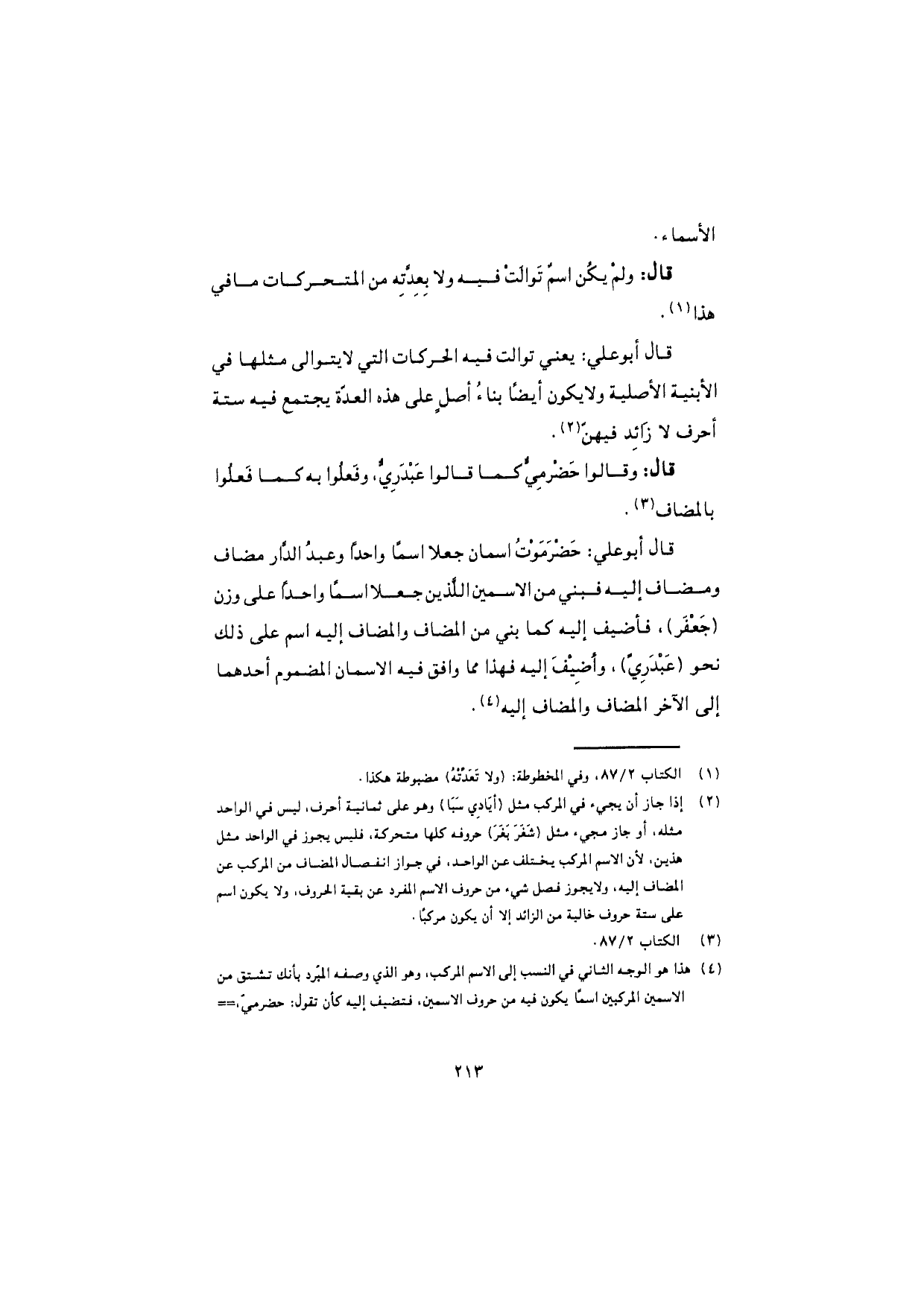 قال أبو علي: حَضْرَمَوْتُ اسمان جعلا اسمًا واحدًا وعبدُ الدّار مضاف ومضاف إليه فبني من الاسمين اللَّذين جعلا اسمًا واحدًا على وزن (جَعْفَر)، فأضيف إليه كما بني من المضاف والمضاف إليه اسم على ذلك نحو (عَبْدَرِيّ)، وأضيفَ إليه فهذا مما وافق فيه الاسمان المضموم أحدهما إلى الآخر المضاف والمضاف إليه.