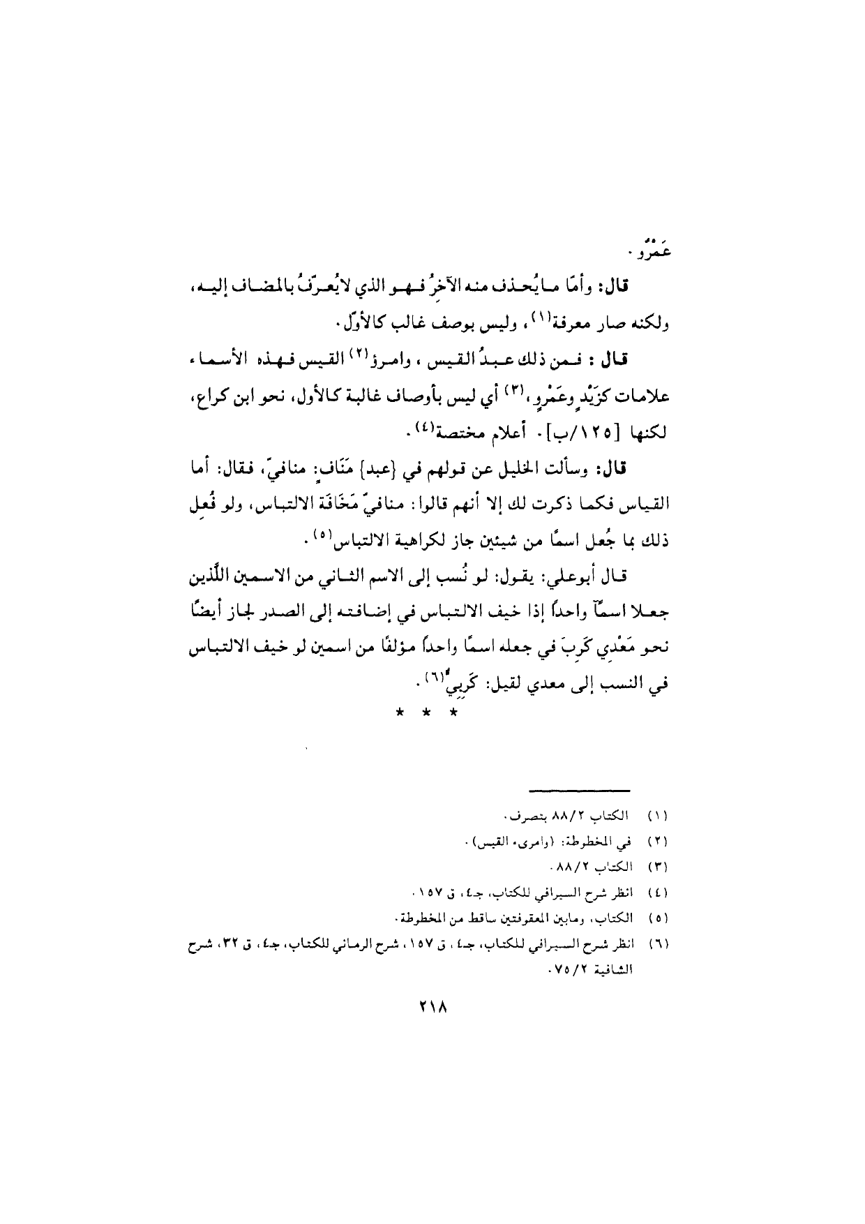 قال: وسألت الخليل عن قولهم في ({عبد} مَنافٍ: منافِيّ، فقال: أما القياس فكما ذكرت لك إلا أنهم قالوا: منافيّ مَخافة الالتباس، ولو فُعِل ذلك بما جُعل اسمًا من شيئين جاز لكراهية الالتباس.