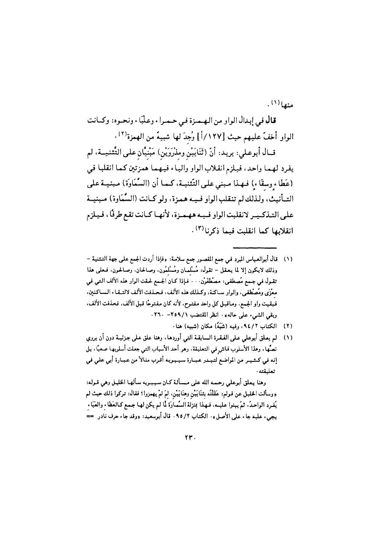 قال أبو علي: يريد: أنّ (ثَنايَيْنِ ومِذْرَوَيْنِ) مَبْنِيّان على التّثنية، لم يفرد لهما واحد، فيلزم انقلاب الواو والياء فيهما همزتين كما انقلبا في (عَطاءٍ وسِقاءٍ) فهذا مبني على التّثنية، كما أن (السَّماوَة) مبنية على التأنيث، ولذلك لم تنقلب الواو فيه هـ همزة، ولو كانت (السَّماوة) مبنية على التذكير لانقلبت الواو فيه همزة، لأنها كانت تقع طرفًا، فيلزم انقلابها كما انقلبت فيما ذكرنا.