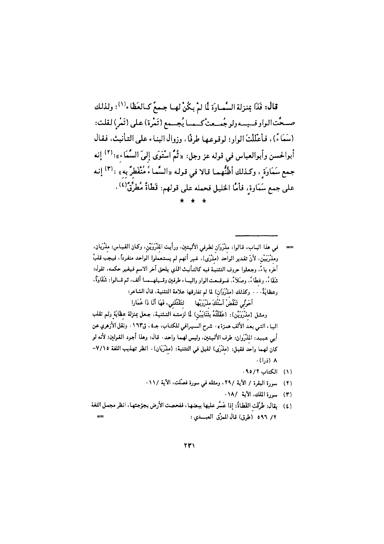 قال: فَذا بمنزلة السَّماوَة لما لم يكن لها جمعٌ كالعَظاء؛ ولذلك صحَّت الواو فيه ولو جُمعتْ كما يُجمع (تَمْرة) على (تَمْرٍ) لقلت: (سَماءٌ)، فأعْلَلْتَ الواو لوقوعها طرفًا، وزوال البناء على التأنيث، فقال أبو الحسن وأبو العباس في قوله عز وجل: "ثم استوى إلى السماء": إنه جمع سَماوَةٍ، وكذلك أظُنُّهما قالا في قوله "السماءُ منفطِرٌ به": إنه على جمع سَماوةٍ، فأمّا الخليل فحمله على قولهم: قَطاةٌ مُطرِّقٌ.